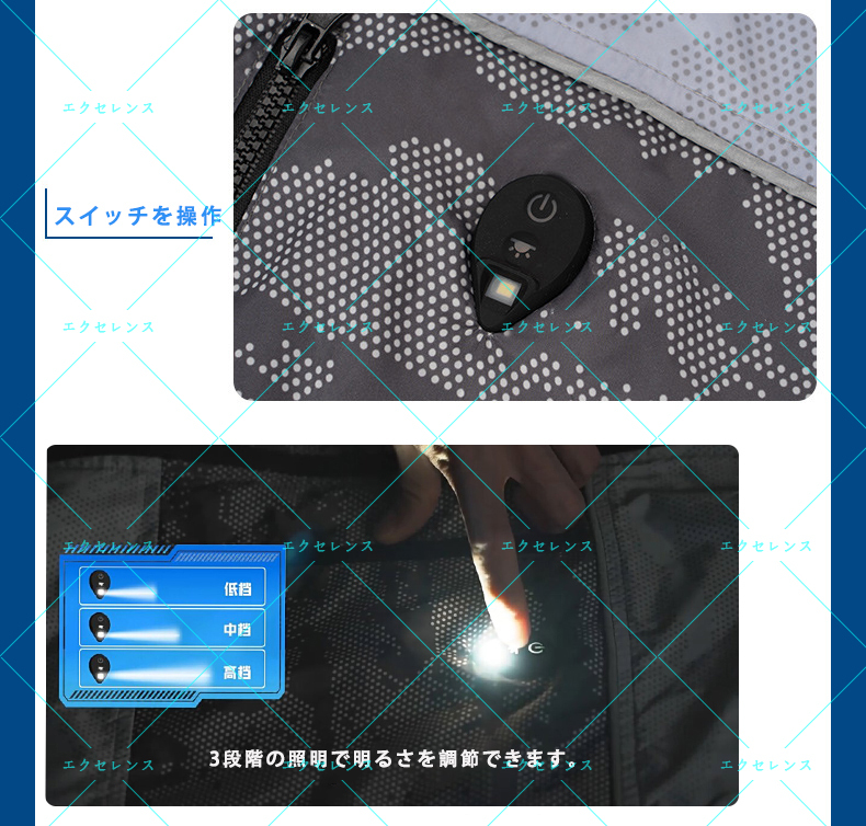 ★【接続方法】DCケーブルで作業服ファとバッテリーを接続して、バッテリーの電源ポタンを押すと、12V-17V-19V-24Vの順番に調整できます。