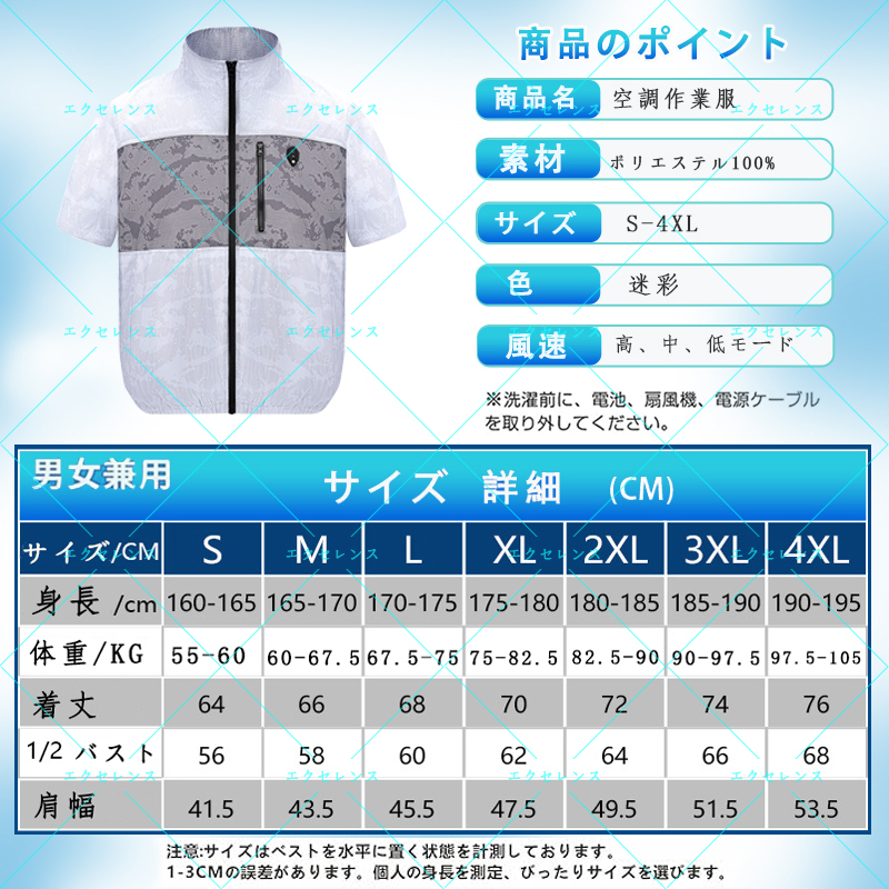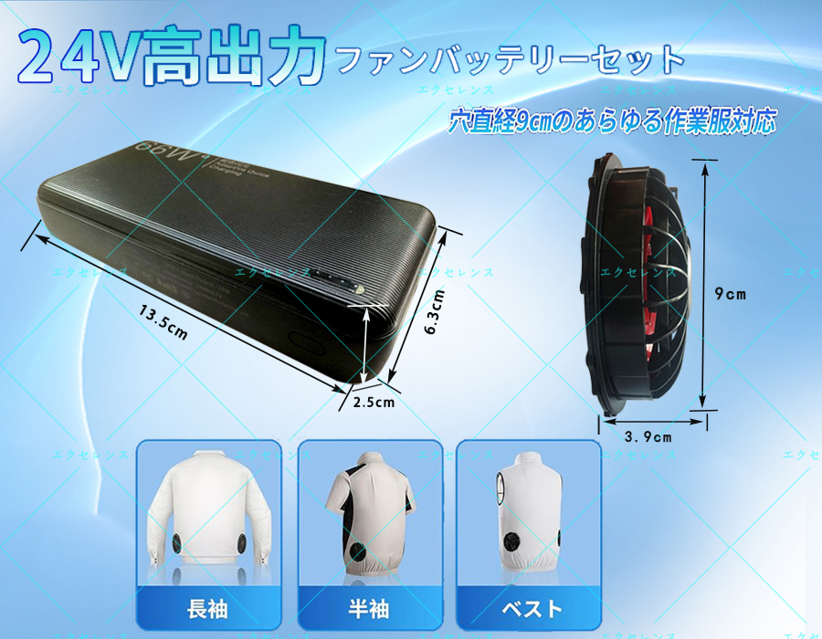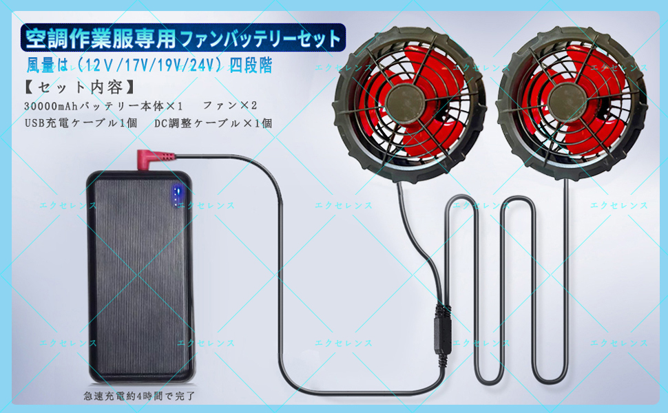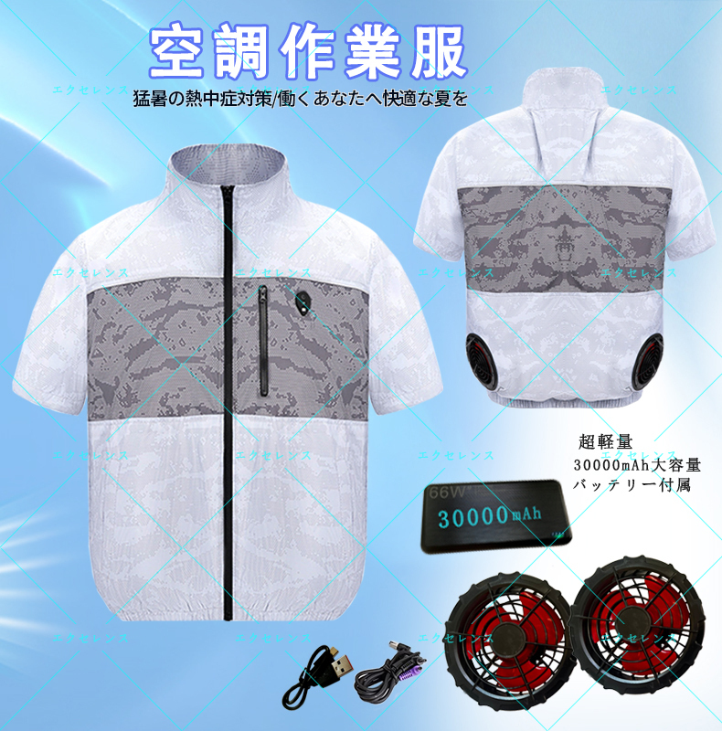 ★【セット内容】】半袖*1、 30000mAhバッテリー*1、 USB充電ケーブル*1、 ファン*2 、 DC接続ケーブル*1  。