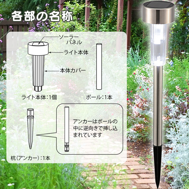 ライト…本体金属(ステンレス鋼)+ポリスチレン、ポール…金属(ステンレス鋼)/杭(アンカー)ポリプロピレン