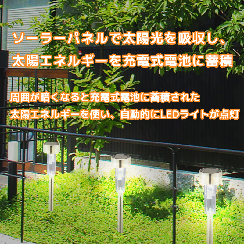 ● 周囲が暗くなると充電式電池に蓄積された太陽エネルギーを使い、自動的にLEDライトが点灯