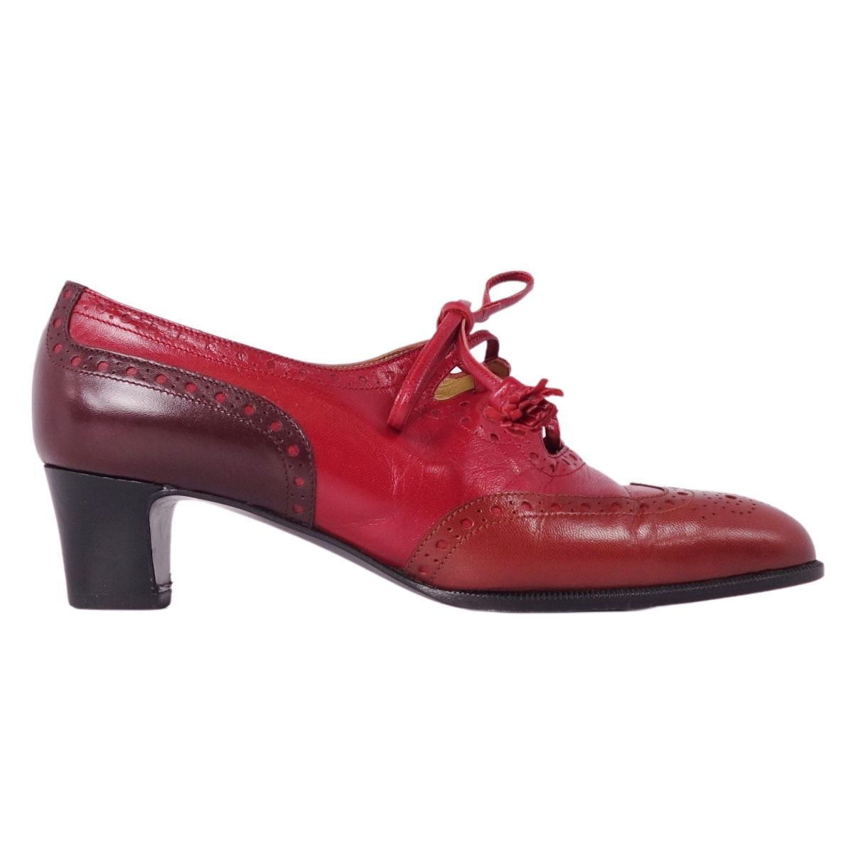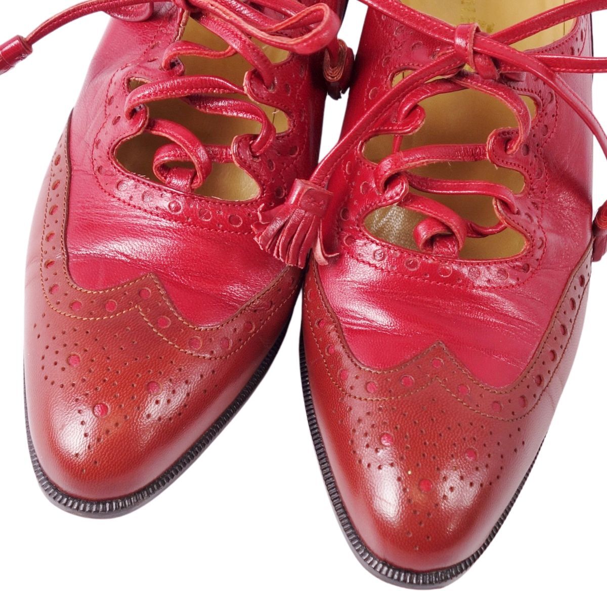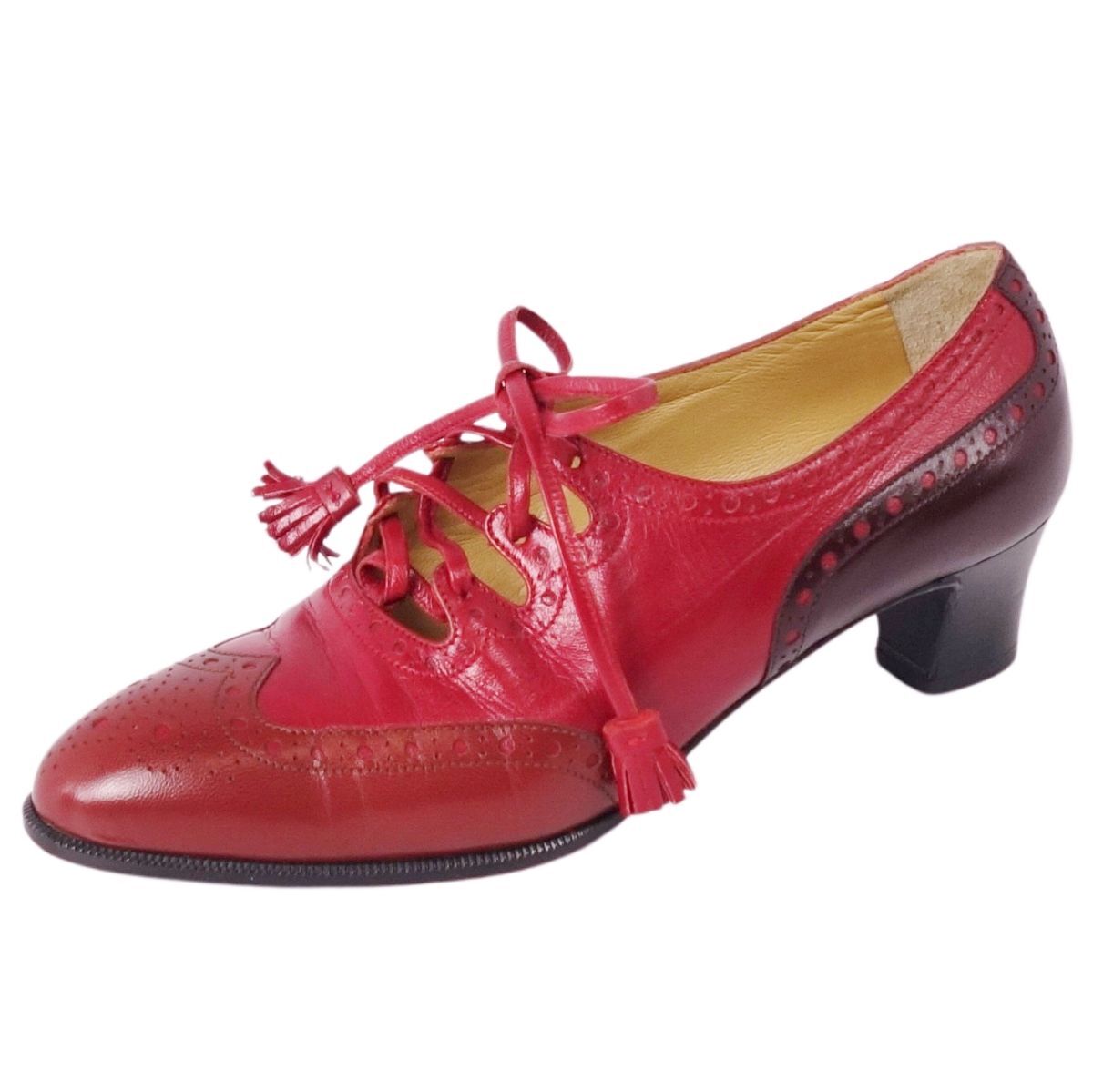 | 美品 Vintage エルメス HERMES パンプス レザーシューズ メダリオン リボン ヒール シューズ レディース 35(22cm)レッド |