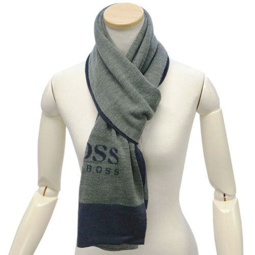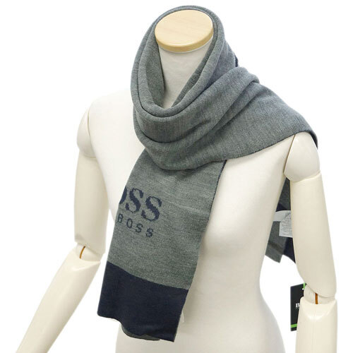 未使用 ヒューゴ・ボス マフラー HUGO BOSS 50393128 メンズ シンプル バイカラー ロゴ ネイビー 杢グレー 灰色 19073