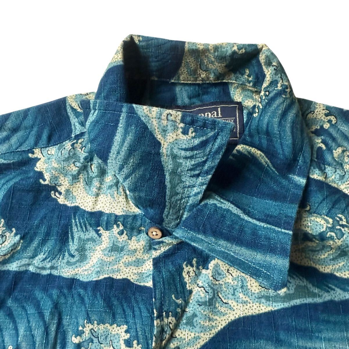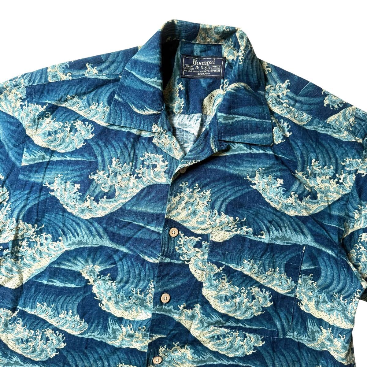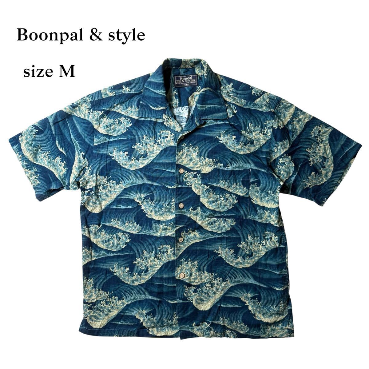 極美品 Boonpal & style ブーンパル 半袖 開襟 アロハシャツ オープンカラー シャツ 荒波 海 総柄 青 ブルー トップス サイズ M