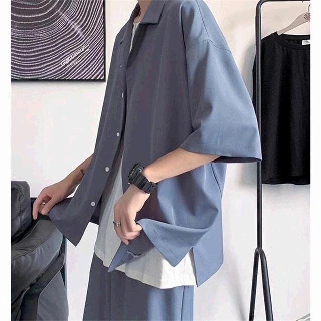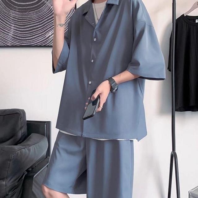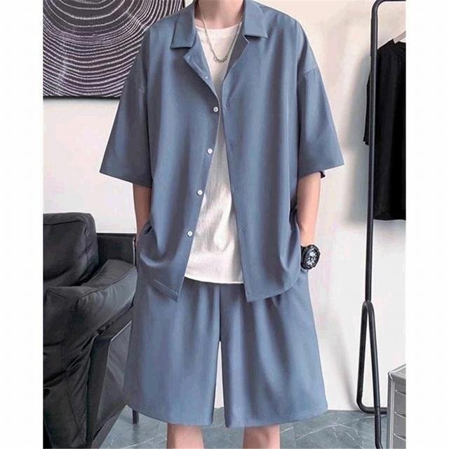 上下セット メンズ シャツ ショートパンツ カジュアル ゆったり 接触冷感 父の日 ジャージ 半袖薄手 ブルー 2XL