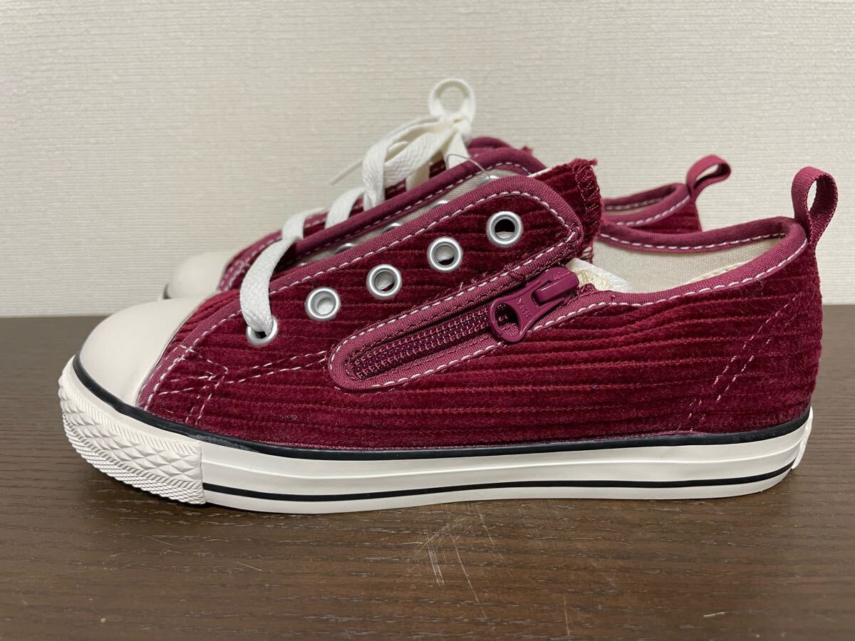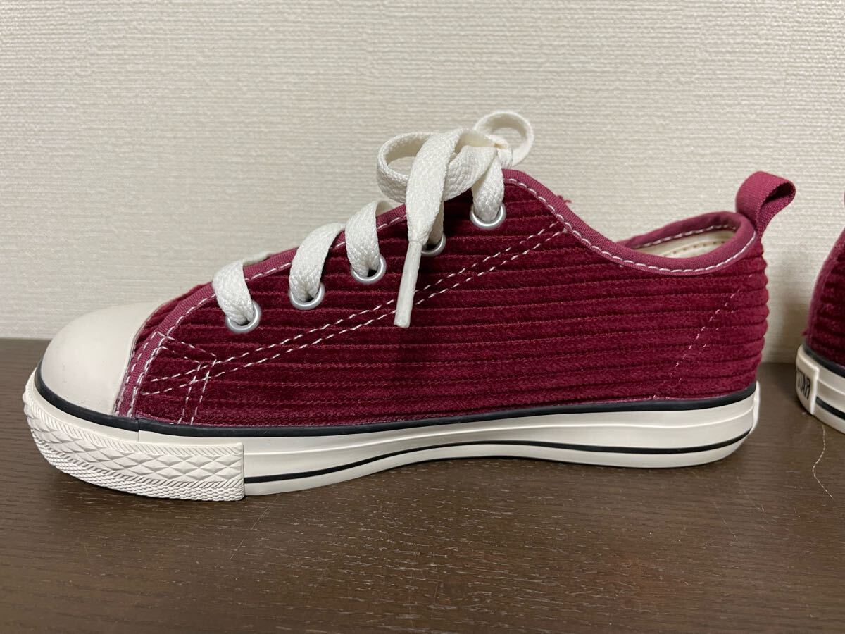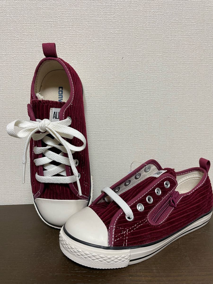 コーデュロイ素材のバーガンディカラーのスニーカーです。