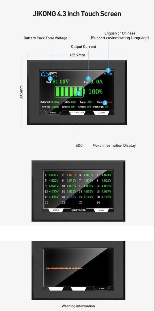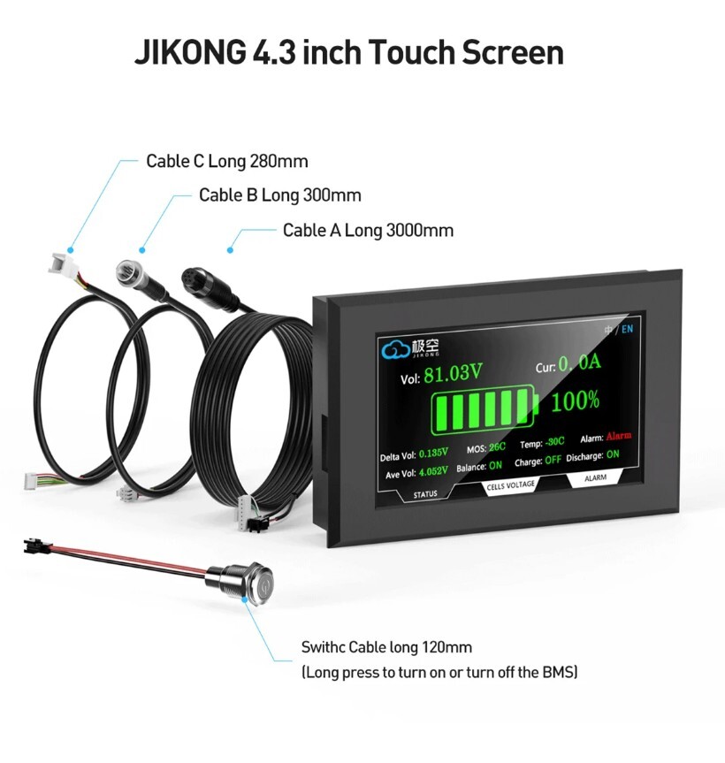 【セット販売】JK-BMS B1A8S-10P 100A アクティブバランサー内蔵 Li-ion Lifepo4 LTO対応スマートBMSと4.3インチタッチパネル外部モニターJK05