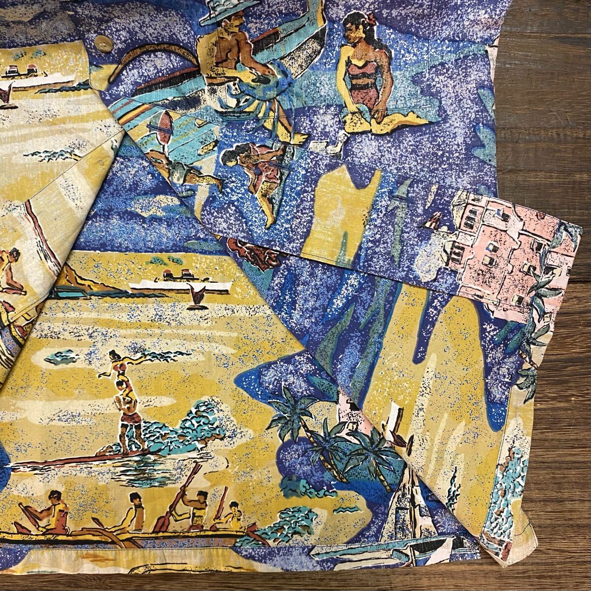 ※撮影環境が蛍光灯の下でスマートフォン撮影のためか、モニター、スマホ画面の環境により、アロハシャツ全体画像(前後とも)が実物よりも青っぽく見える場合があります。ご了承ください。