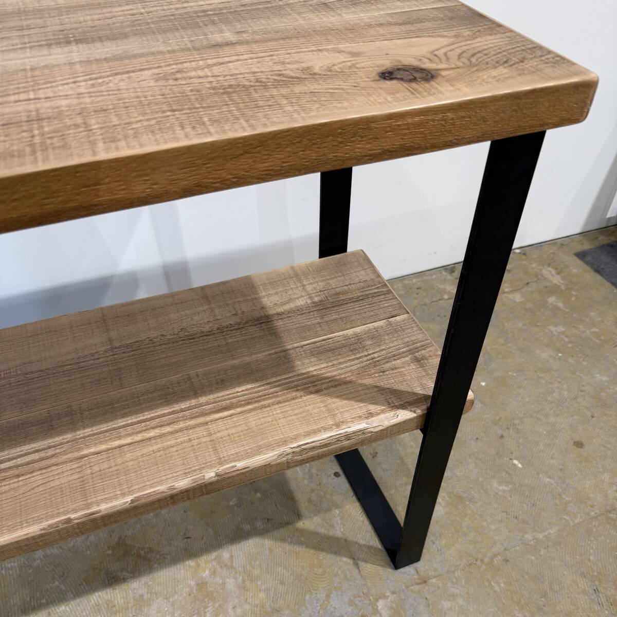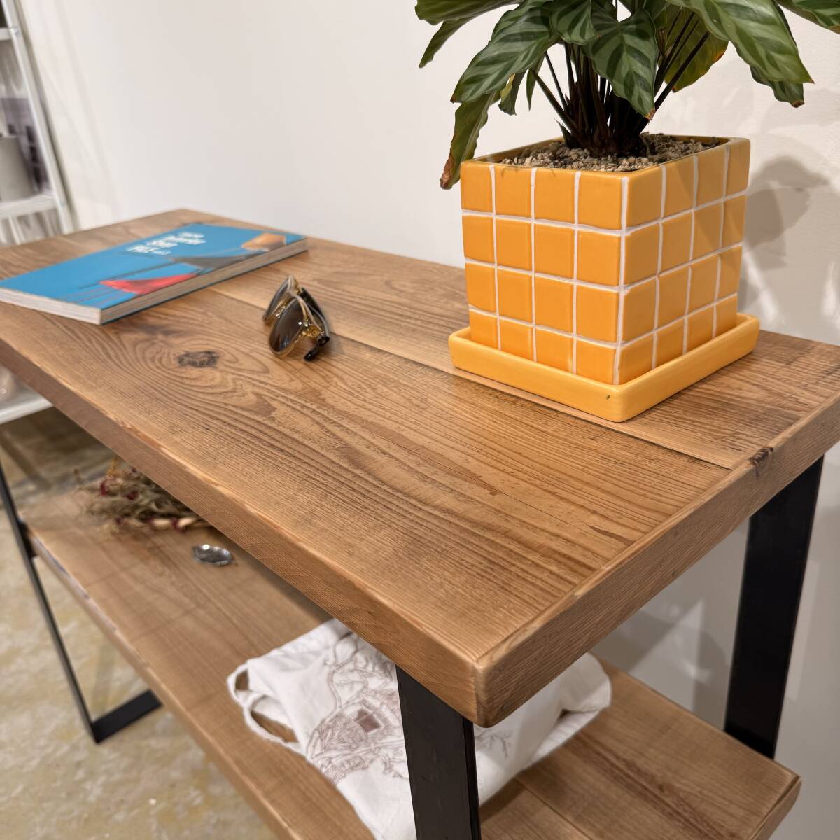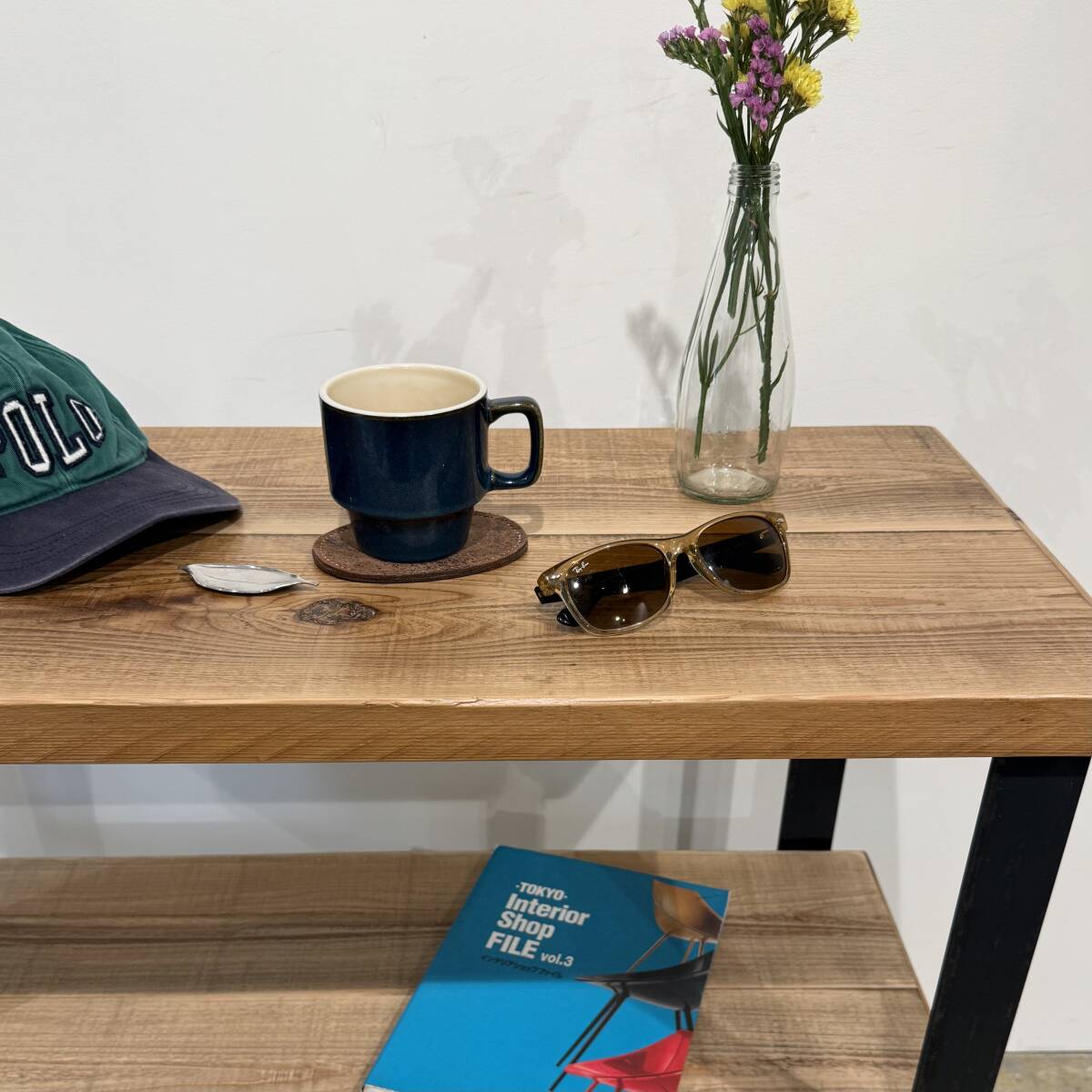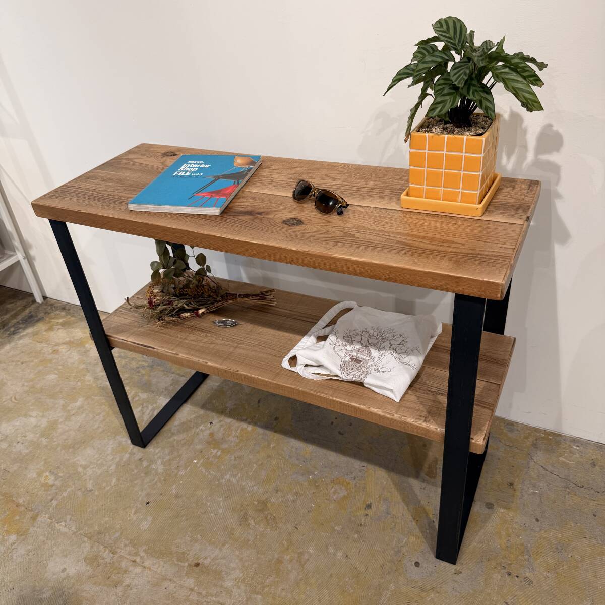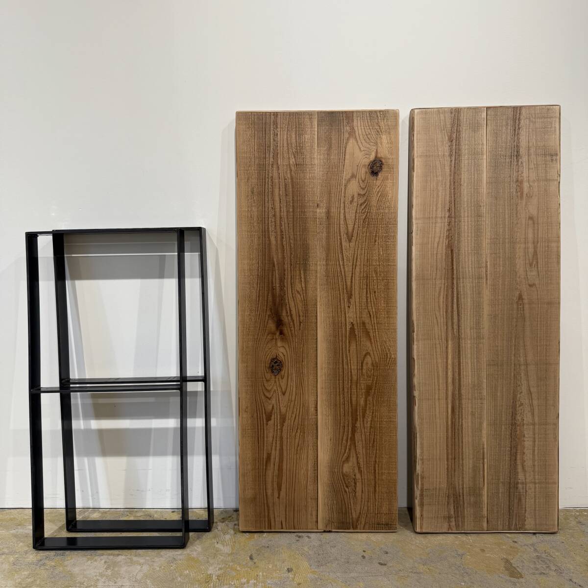 褪せたボード(以下古材板)と溶接を施したアイアン脚を組み合わせ、