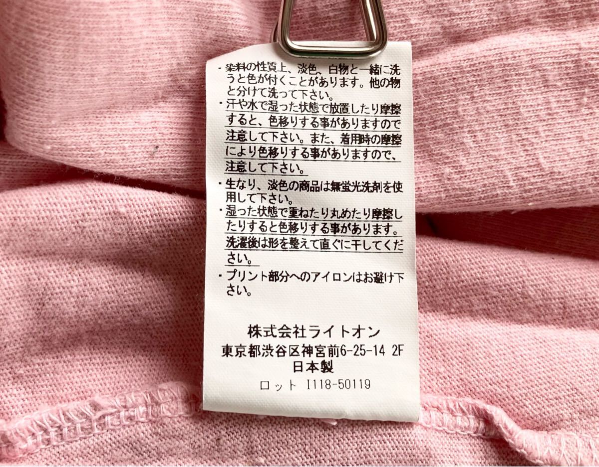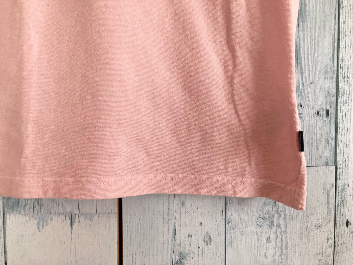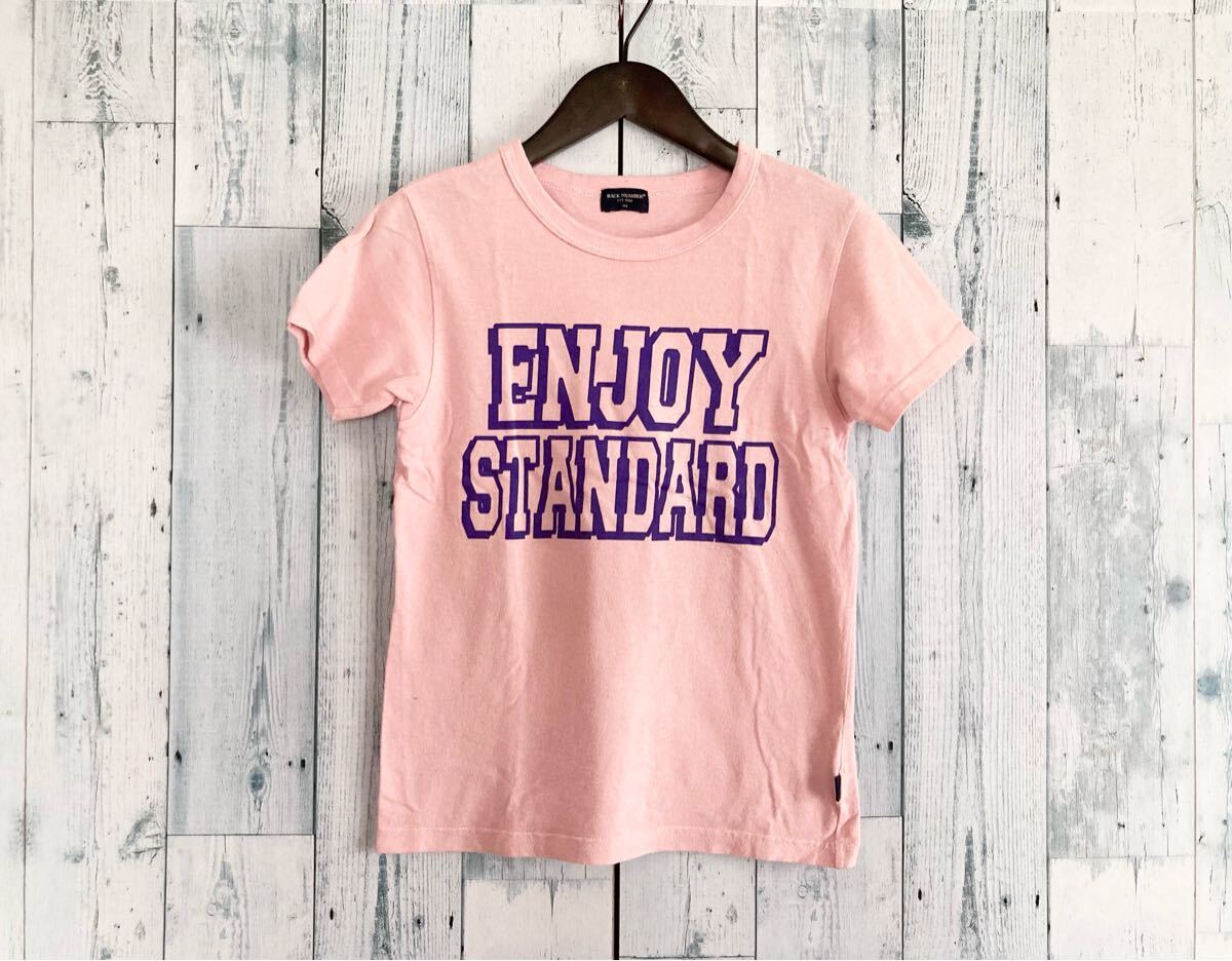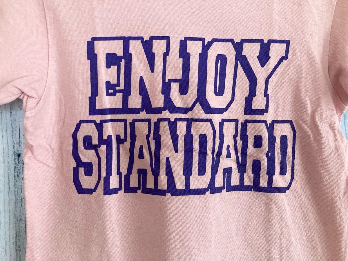 くすみピンクにパープルの文字がプリントされたおしゃれなTシャツです。