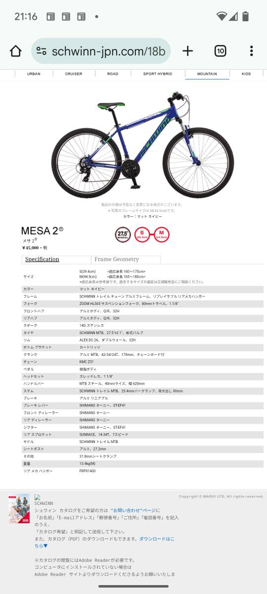 カラーマット ネイビー フレームSCHWINN トレイル チューン アルミフレーム、リプレイサブル リアメカハンガー フォークZOOM HL565 サスペンションフォーク、80mmトラベル、1.1/8" フロントハブアルミボディ、Q/R、32H リアハブアルミボディ、Q/R、32H スポーク14G ステンレス タイヤSCHWINN MTB、27.5"×2.1"、米式バルブ リムALEX DC-26、ダブルウォール、32H ボトム ブラケットカートリッジ クランクアルミ MTB、42/34/24T、170mm、チェーンガード付 チェーンKMC Z51 ペダル樹脂ボディ ヘッドセットスレッドレス、1 1/8" ハンドルバーMTB スチール、40mmライズ、幅 620mm ステムSCHWINN トレイル MTB、25.4mmバークランプ、突き出し 90mm ブレーキアルミ リニアプル ブレーキ レバーSHIMANO ターニー、ST-EF41 フロント ディレーラーSHIMANO ターニー リア ディレーラーSHIMANO ターニー シフターSHIMANO ターニー、ST-EF41 リア スプロケットSUNRACE、14-34T、7スピード サドルSCHWINN トレイル MTB シートポストアルミ、27.2mm その他31.8mmシートクランプ 重量13.4kg(M)