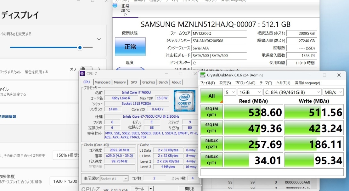 | CPU: 超高速 Intel 七世代Core i7-7600U 2.8Ghz、 (ターボ・ブースト利用時の最大周波数 3.9GHz) |