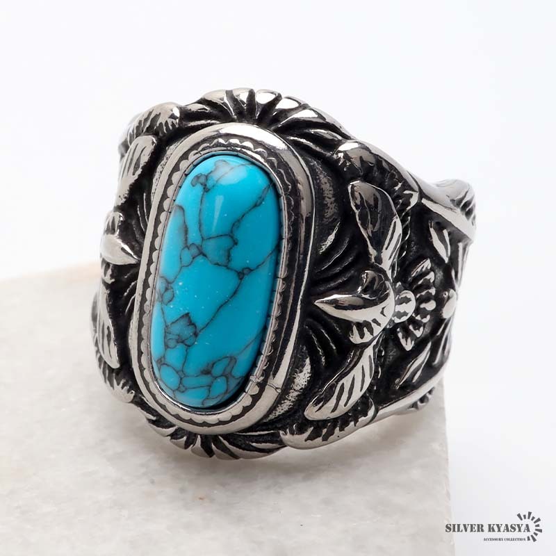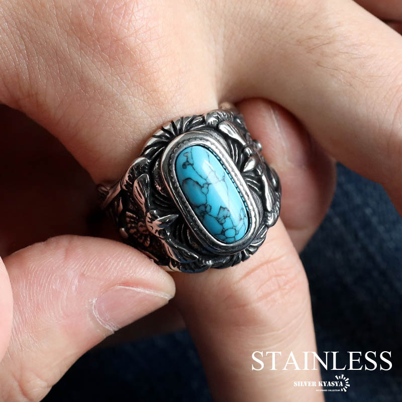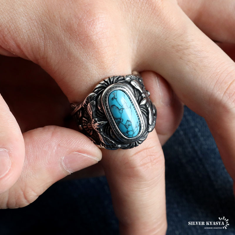 大粒のターコイズストーンをセットしたリング。繊細に刻まれたインディアン風の模様が絶品。しっかりとした存在感と重厚感のある仕上がり。