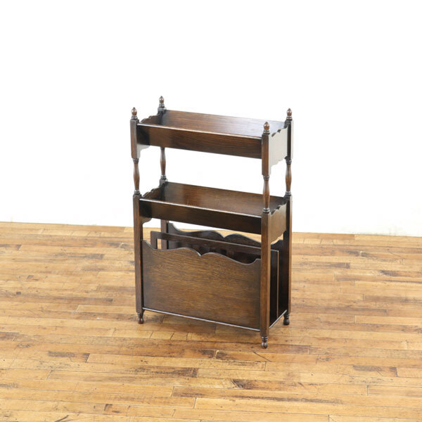 上がブックラック、下部分には雑誌や新聞などが収納できるラック状になったお品です。ブックラック部分は背表紙が見やすいようにこの様な形状になっています。