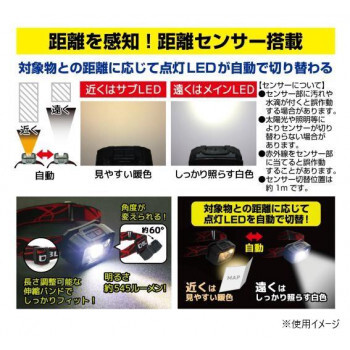 LED距離センサーヘッドライトです。対象物との距離に応じて、点灯LEDが自動で切り替わります。 ※照射距離は、月の光(約0.2lx)以上の明るさで照らすことのできる距離を言います。 ※実際には使用場所の温度・湿度、その他の条件により多少前後します。 |