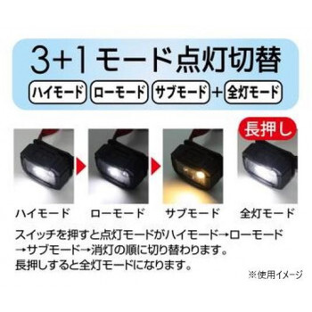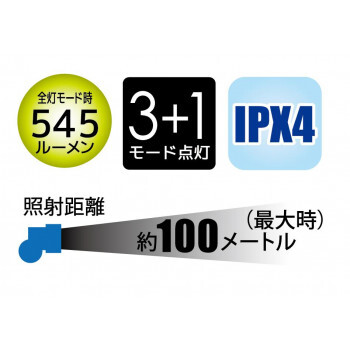 仕様 | 明るさ(全灯モード):約545ルーメン 明るさ(ハイモード):約490ルーメン 明るさ(ローモード):約120ルーメン 明るさ(サブモード):約60ルーメン 点灯時間(全灯モード):約1時間40分 点灯時間(ハイモード):約1時間55分 点灯時間(ローモード):約8時間40分 点灯時間(サブモード):約29時間 照射距離:約100m(最大時) 電源:単4アルカリ乾電池3本(別売) |