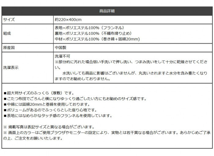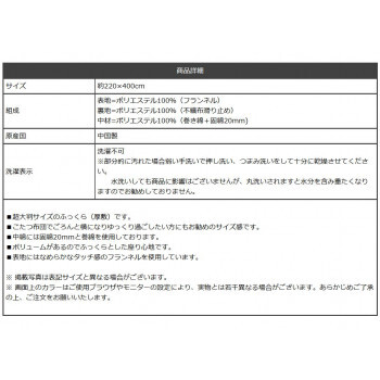 | 素材・材質 | 表地:ポリエステル100%(フランネル)、裏地:ポリエステル100%(不織布)、中材:ポリエステル100%(巻き綿+固綿20mm) |