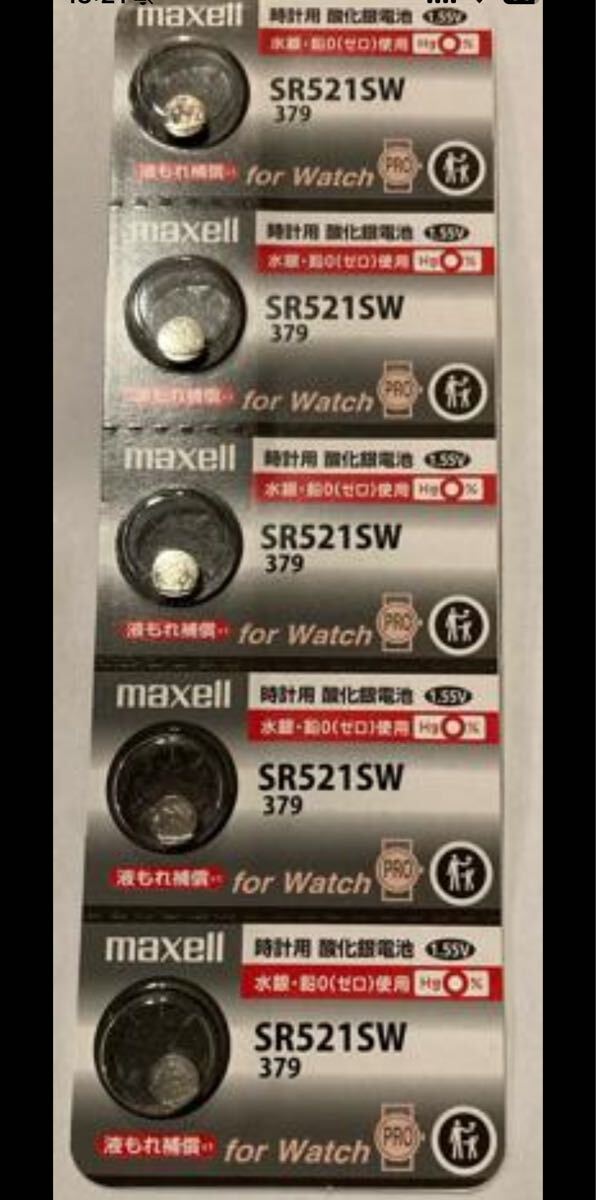 ブランド:マクセル 品名:時計用酸化銀電池(SR) 5個1シート 品番:【SR521SW379】 . 電圧:1.55V 製造・発売元:マクセルホールディングス 日本製 使用推奨期限10/2026 お使いのモニターによって色が違って見える場合がございます。 ご了承くださいませ。 3営業日以内に発送可能です。