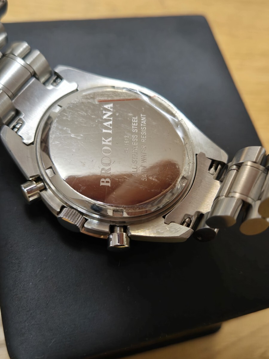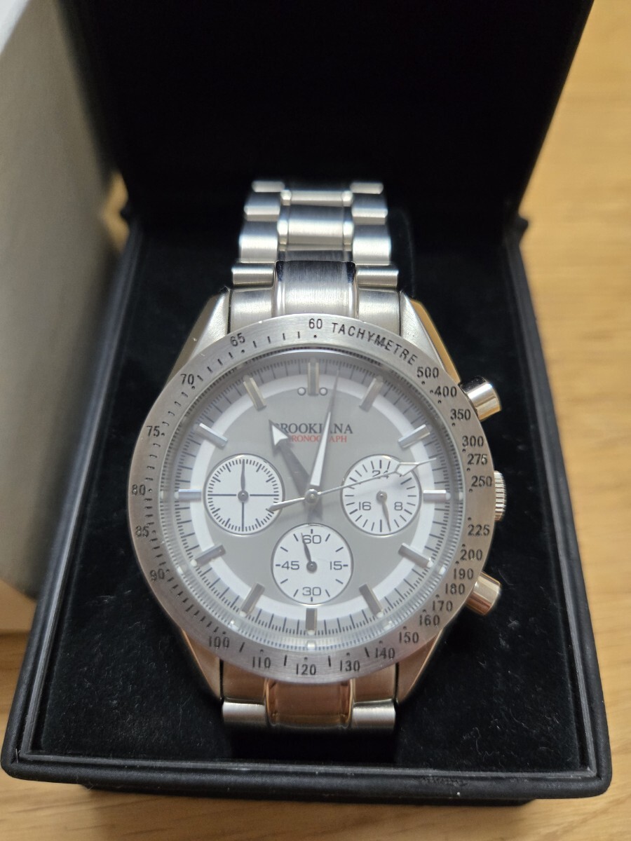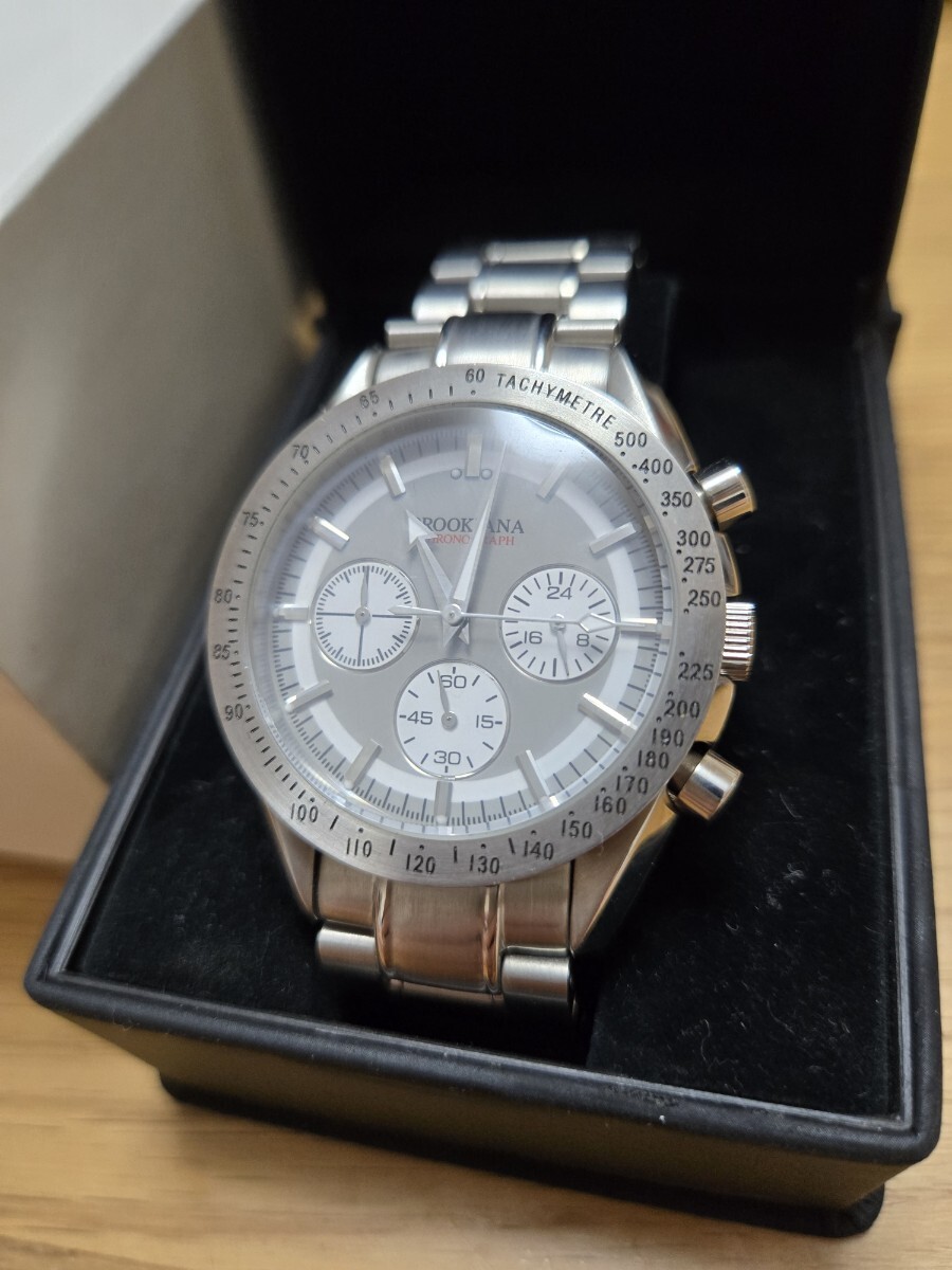 即決!腕時計 ラスト1本! ブルッキアーナ BROOKIANA グレー文字盤 ビックアロー オメガをオマージュして作られたモデルです ガラス傷無し、裏ブタ保護シール付 クオーツ製、電池交換済み! ケース径 リューズ含み約43ミリ リューズ含まない約41ミリ ステンレス製 ベルトコマ数16コマ 付属品、箱付