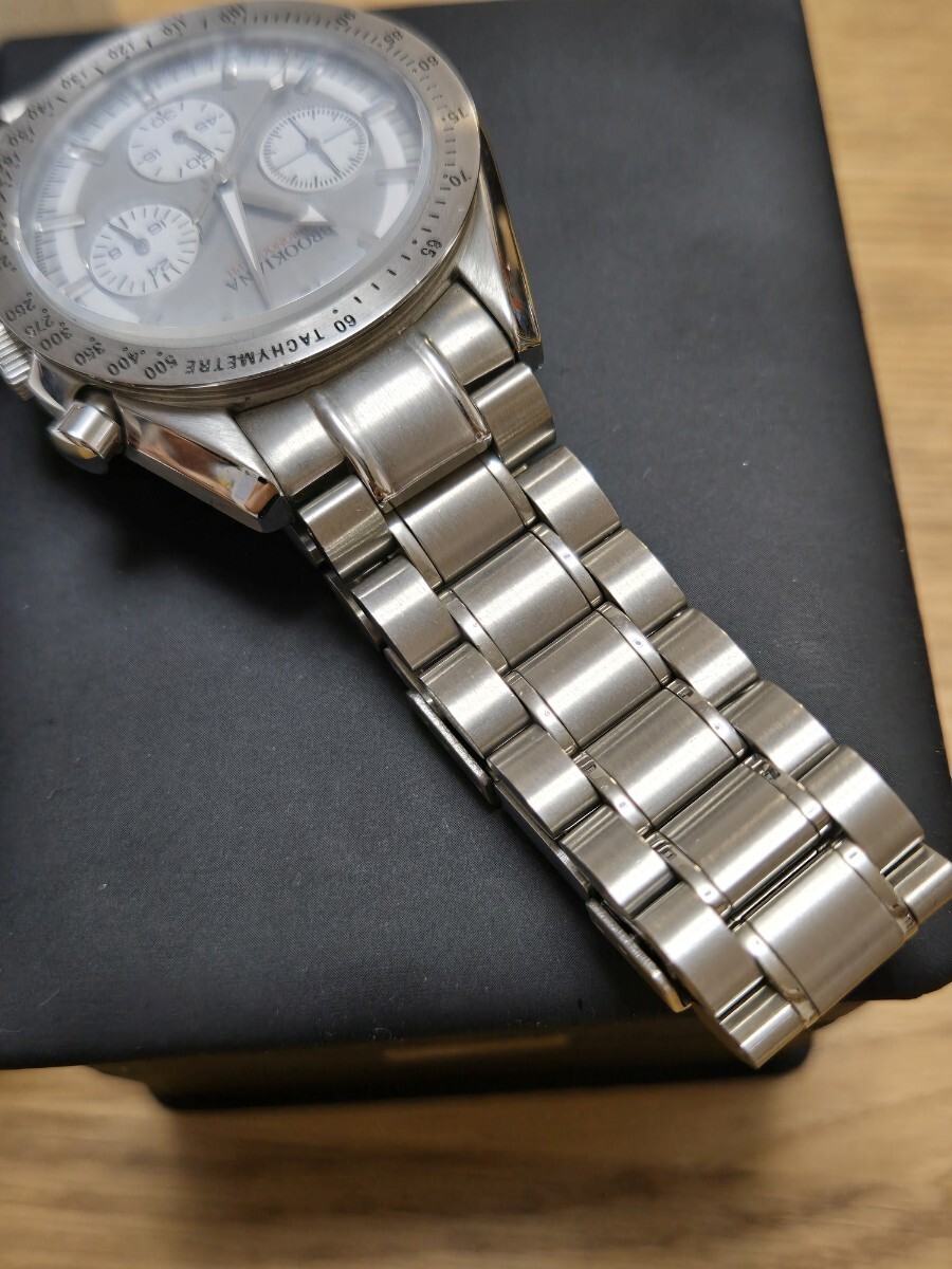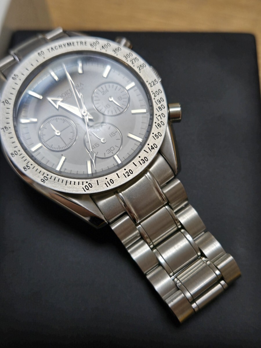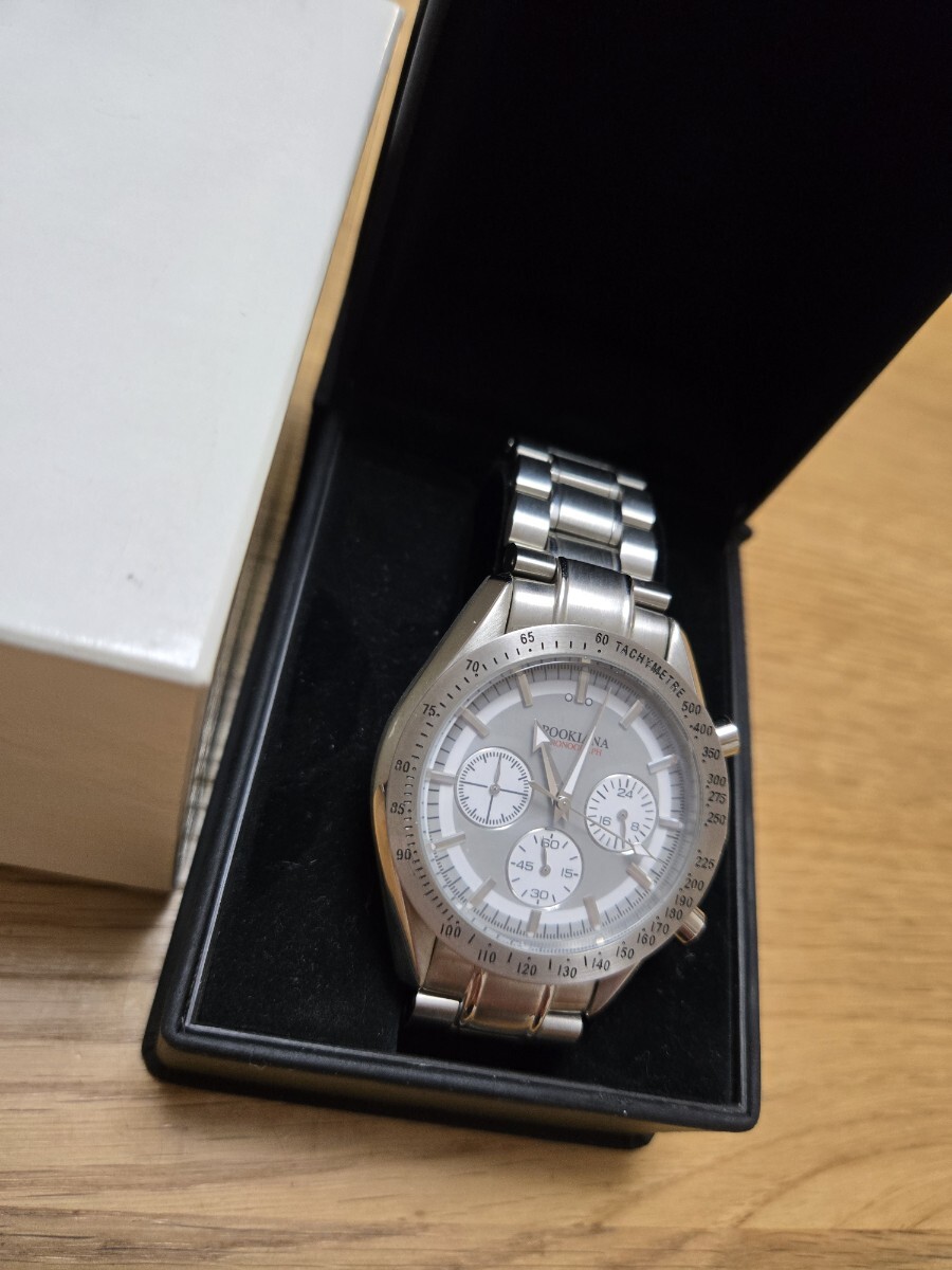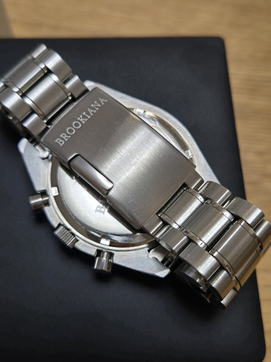 即決!腕時計 ラスト1本! ブルッキアーナ BROOKIANA グレー文字盤 ビックアロー オメガをオマージュして作られたモデルです ガラス傷無し、裏ブタ保護シール付 クオーツ製、電池交換済み! ケース径 リューズ含み約43ミリ リューズ含まない約41ミリ ステンレス製 ベルトコマ数16コマ 付属品、箱付