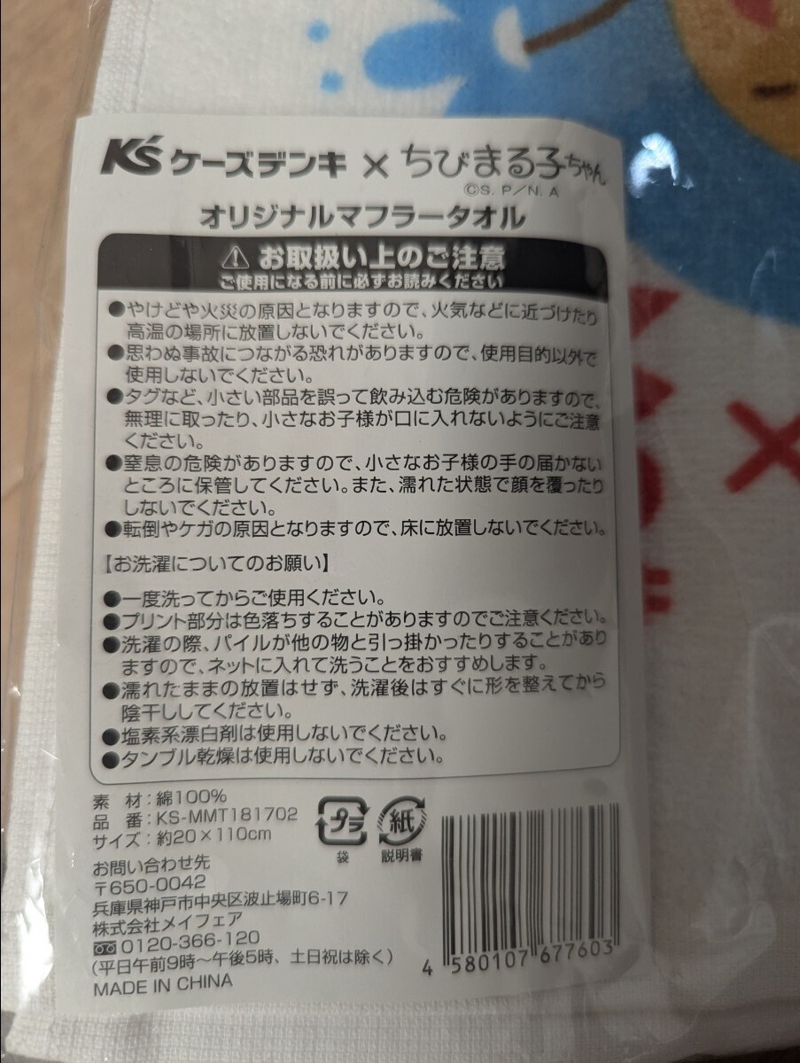 こちらは、ケーズデンキ×ちびまる子ちゃんの非売品マフラータオルになります。