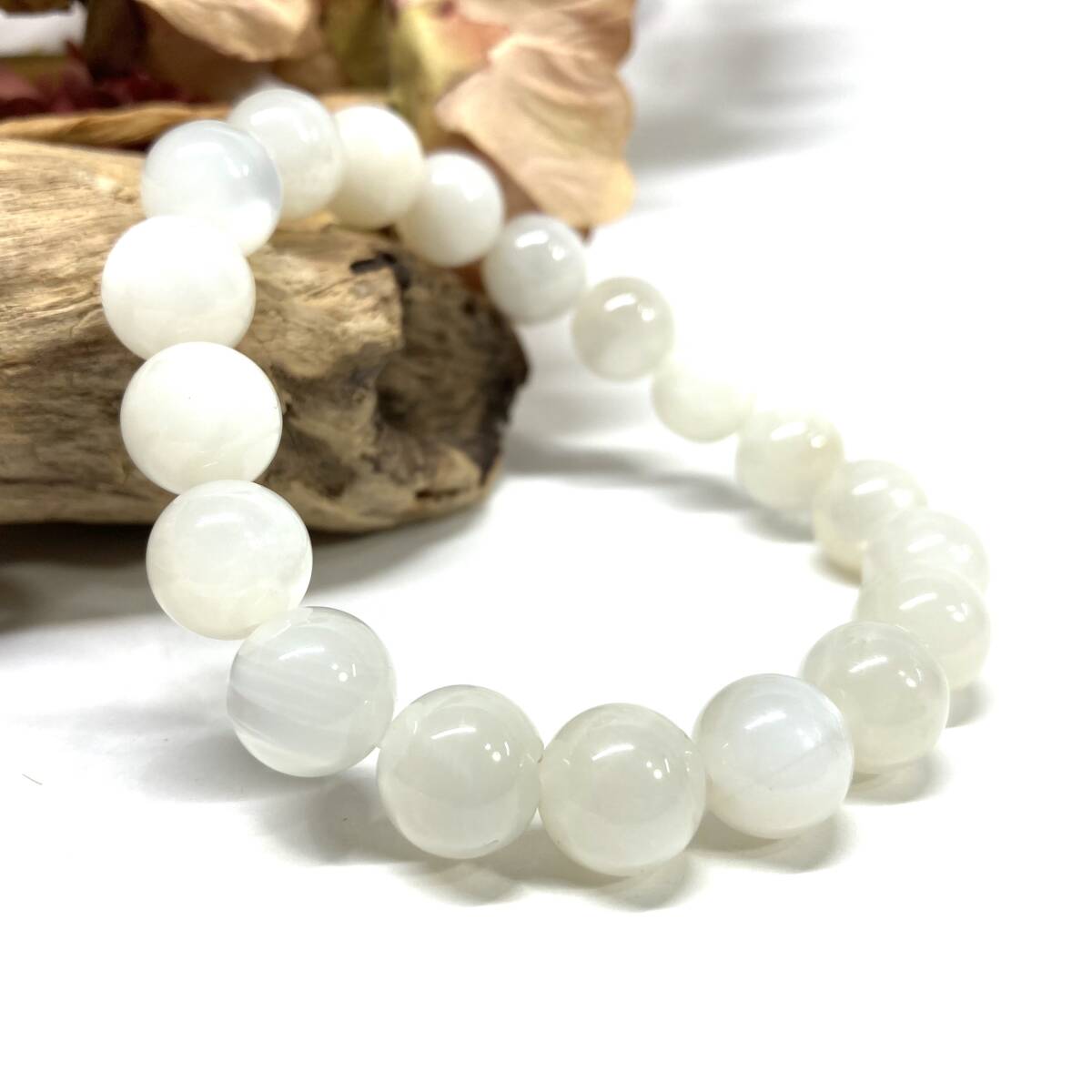 こちらは、10mm玉のムーンストーンを使用したパワーストーンブレスレットです。シンプルなデザインは、男女問わずどんなコーディネートとも合わせ易いブレスレットです。サイズは内周約17cmです。数に限りがございますので気になる方はお早めにどうぞ。