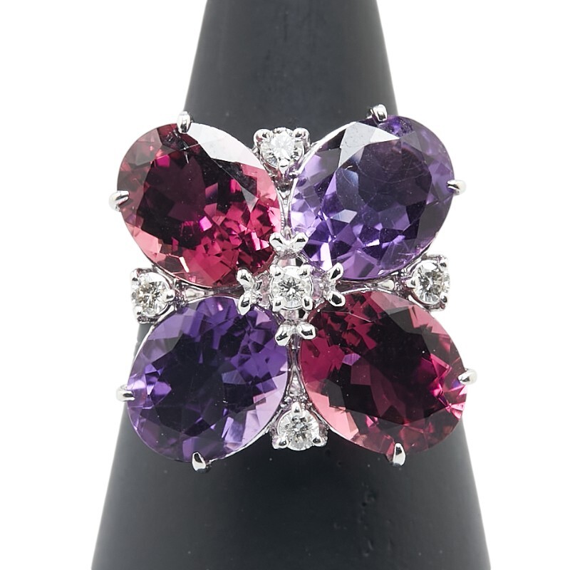 K18WG ホワイトゴールド ダイヤ0.20ct ガーネット4.94ct アメジスト3.97ct 花 フラワー モチーフ リング 指輪 レディース 13号 中古