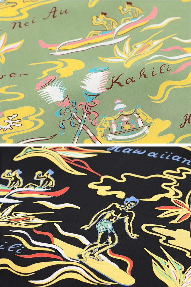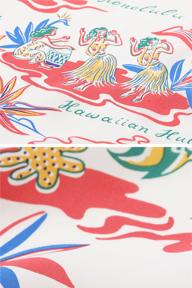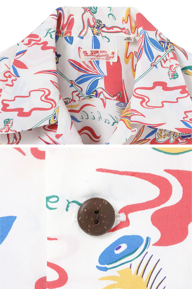 アロハシャツの黄金時代とされる1930~50年代にかけて作られた「ヴィンテージ」と呼ばれる貴重なアロハシャツを再現し、現代に蘇らせているブランド「SUN SURF」から、レーヨンアロハシャツ「HAWAIIAN HULA」(SS39411)のご紹介です。 フラ、ダイビング、サーフィンなど、ハワイのアクティビティは当時からアロハシャツのモチーフとしても高い人気がありました。 戦後から本格的にシャツのマーケットに参入したホロホロ・アパレル・マニュファクチャリング社のブランド「ホロホロ」が製作した一枚です。 トーマス・スティールによって書かれたアロハシャツの専門書「The Hawaiian Shirt」にも掲載されており、ヴィンテージ・コレクターからの支持も厚く、コンディションの良い個体に出会えるチャンスは少なくなってきています。 ボディーには、てろんとしたレーヨン羽二重の生地を採用。 抜染プリントで仕上げられた逸品です。 | ||||||||||||||||||||||||||||||