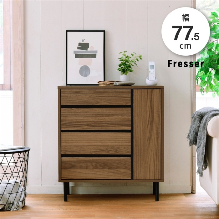 落ち着いた木目調のブラウンとブラックスチールの組み合わせがモダンな印象を与える、北欧テイストシリーズ“Fresser”。 4段のチェストに扉収納がついたワイドチェストは、シンプルだからこそ使いやすいアイテムです。 |
