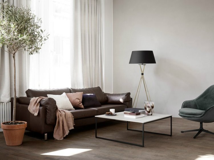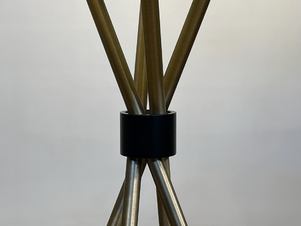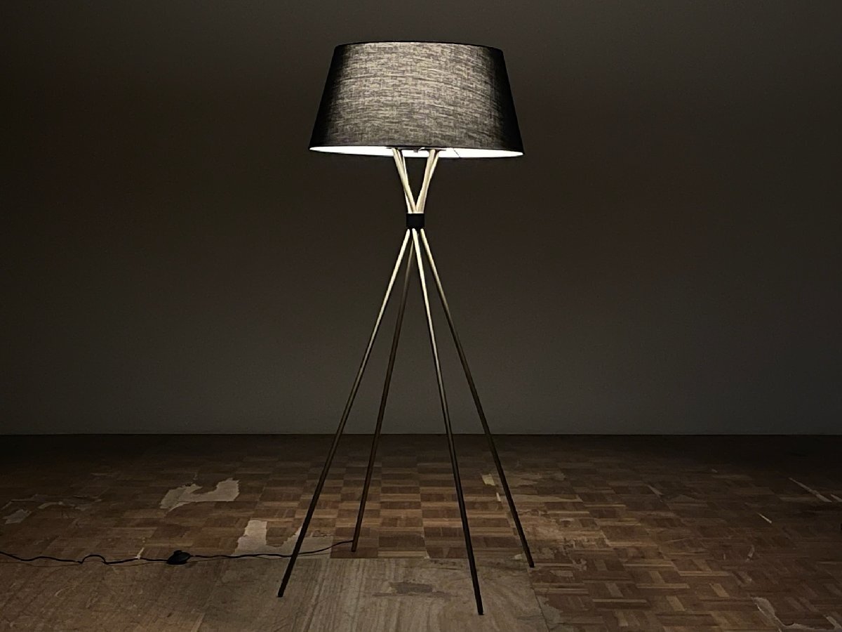 4本のほっそりとシャープなテーパードスチールポールを交差させた フレームに軽やかで涼しげなセードを配したミニマムスタイリッシュなブランドらしいセラーフロアスタンドライト。BoConcept より。
