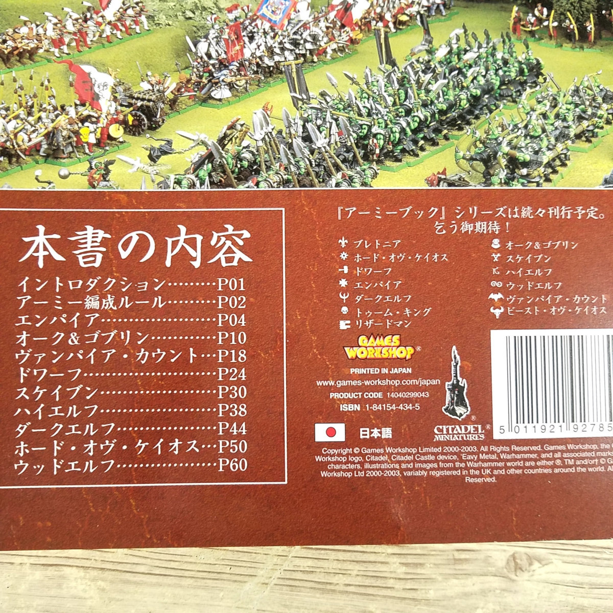 ウォーハンマー・ファンタジー・バトルゲーム第6版「アーミーガイド レイヴニング・ホード」の日本語版。 ウォーハンマーの世界に割拠する9つの勢力の各アーミーリストを一冊にまとめたもの。 ウォーハンマー:ファンタジー・バトルゲーム第6版 【ウォーハンマー 暫定アーミーリスト集 レイヴニング・ホード】 著者:--- 出版社:A GAMES WORKSHOP 発行年:2003?年?月?日 ?版 商品の状態:並。多少の使用感あり(経年変化含む) (折れ少々 / 汚れ少々 / ヨレ少々) 付属品: 備考: ■掲載勢力 ・エンパイア ・オーク&ゴブリン ・ヴァンパイア・カウント ・ドワーフ ・スケイブン ・ハイエルフ ・ダークエルフ ・ホード・オブ・ケイオス ・ウッドエルフ ※ソフトカバー。おおよそA4サイズ。 #ミニチュアゲーム #ウォーハンマー #ウォーハンマー・ファンタジー・バトルゲーム #ウォーハンマー第6版 #ウォーハンマー・日本語版 #アナログゲーム #テーブルゲーム #ウォー・シミュレーションゲーム #ウォーハンマー・アーミーブック #WARHAMMER #WARHAMMER・ARMIES 当商品は中古品です。 状態については、写真もよく参考にしてください。 商品の状態についてできる限り確認・記載しておりますが、見落としがあった場合はなにとぞご容赦ください。 |