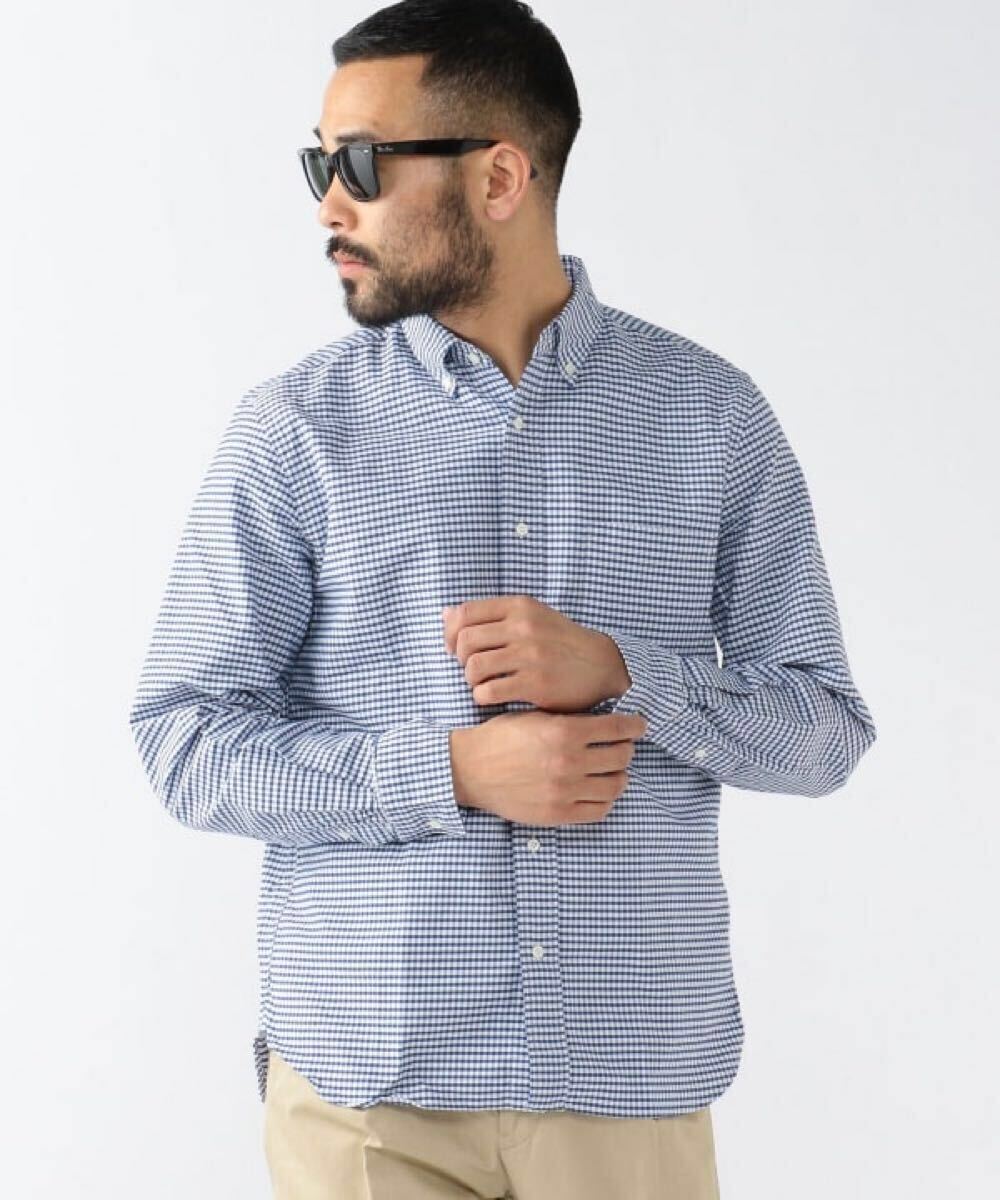 程良いカジュアル感を演出するオックスフォードの生地に、ギンガムチェックの柄をプラスした〈BEAMS PLUS〉ボタンダウンシャツ。無地のオックスフォードとは異なる爽やかな印象の一枚。