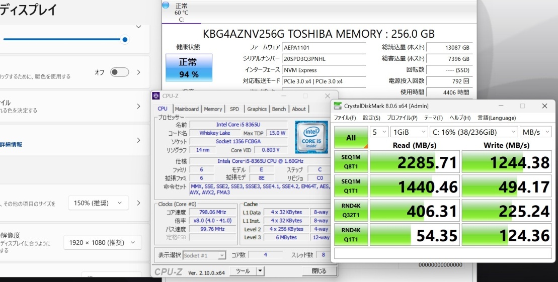 | CPU: 超高速 Intel 高性能 八世代Core i5-8365U 1.6Ghz、 4コア8スレッド (ターボ・ブースト利用時の最大周波数 4.1GHz) |