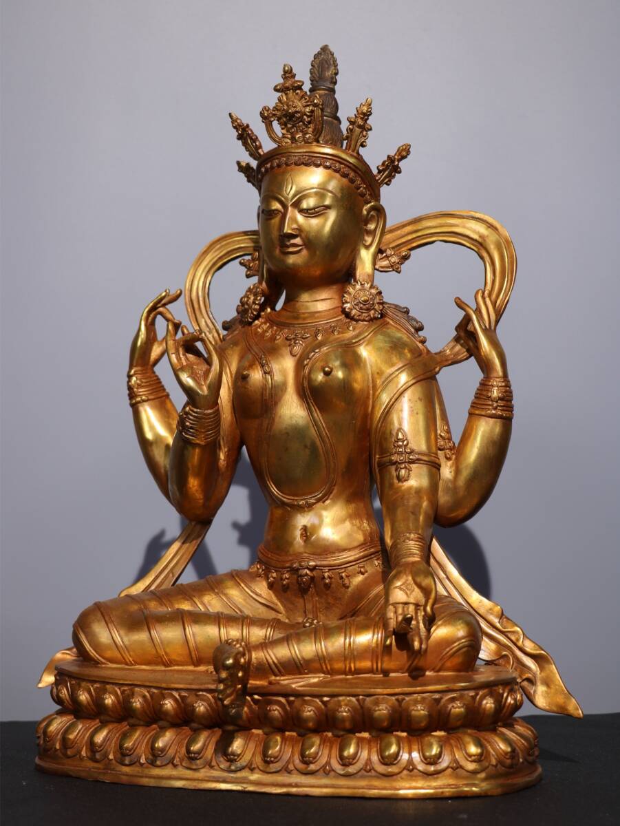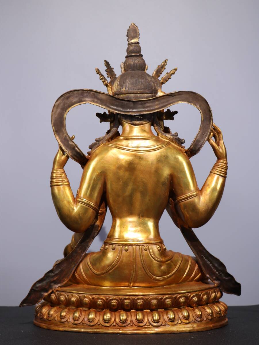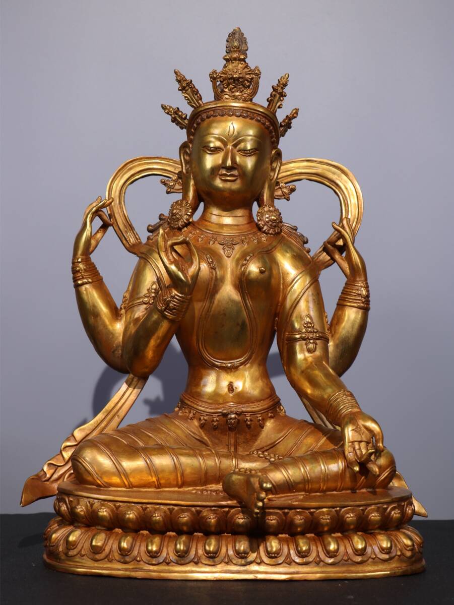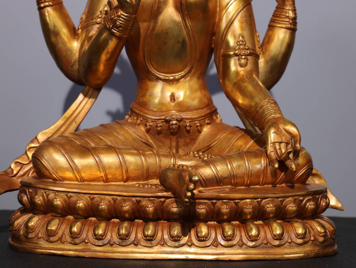 旧蔵 清 純銅塗金仏像【四臂觀音菩薩】 奉納されていた 供養品 銅製品 極細工 中国古玩 骨董品 古美味 206-01