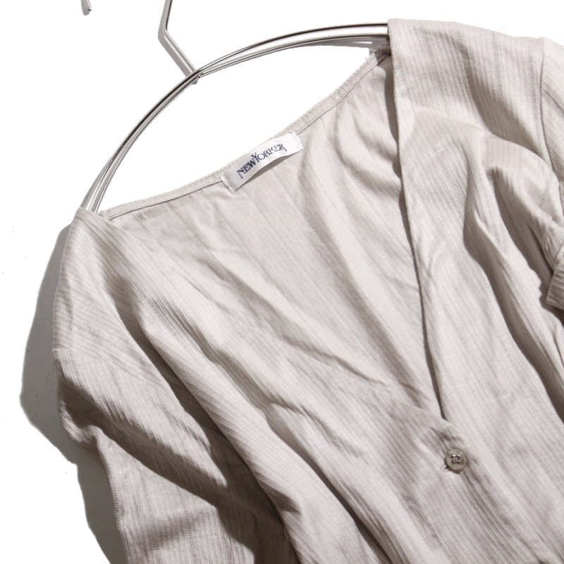 美品 NEWYORKER ニューヨーカー レディース 春 夏 ほんのり艶 点 ストライプ 柄 8分袖 カーディガン M ライトグレー ミセス 羽織 オフィス