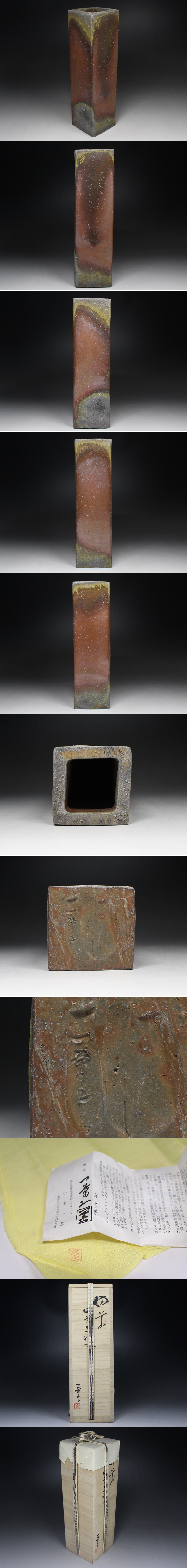 | ■備前■小山満夫・四方花入・花瓶・花器・栞・共布・共箱・f6165h | ||||||||||||||||||||