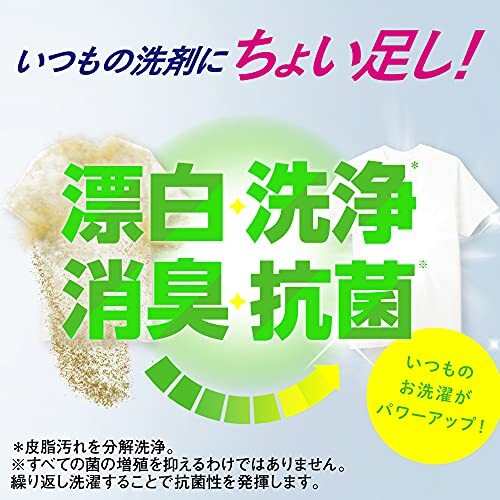 ・ 880ミリリットル (x 3) ・・Size:880ミリリットル (x 3)・商品サイズ(幅×奥行×高さ):48cm×8cm×27cm・内容量:2640ml・洗剤にプラス、ニオイ原因をディープクレンジング・ニオイの元になる、汗・皮脂汚れを強力分解・色柄物に安心な酸素系漂白剤(濃縮タイプ)洗剤だけでは落ちないニオイの元までディープクレンジング。 水にぬれたとき、ニオイ戻りの原因となる蓄積臭*まで強力分解。 繰り返し使用することで抗菌効果を発揮し、衣類の清潔長続き。 色柄物に安心な酸素系漂白剤(濃縮タイプ)。 ●ツンとしないさわやかな花の香り *硫黄化合物などの悪臭原因物質