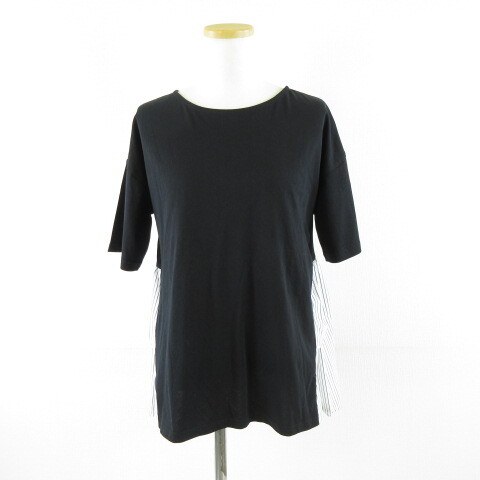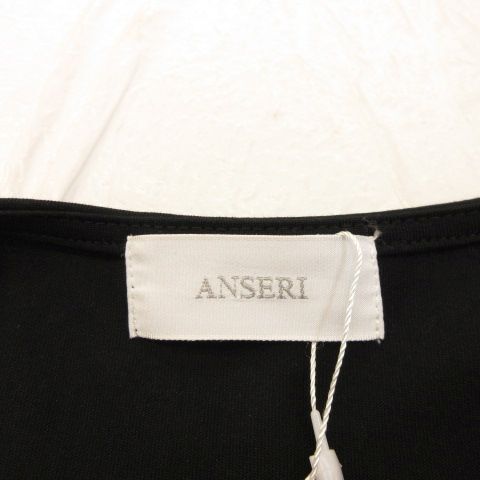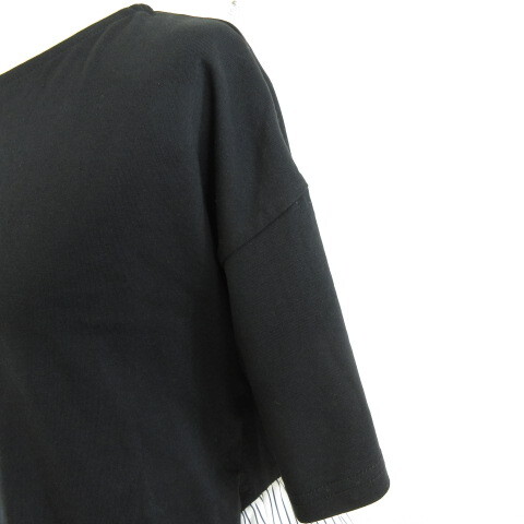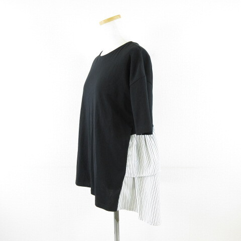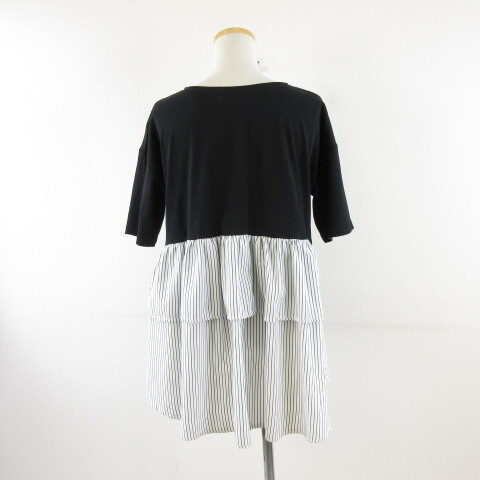 未使用品 ANSERI カットソー フレア 五分袖 ストライプ 黒 白 L *A556 レディース