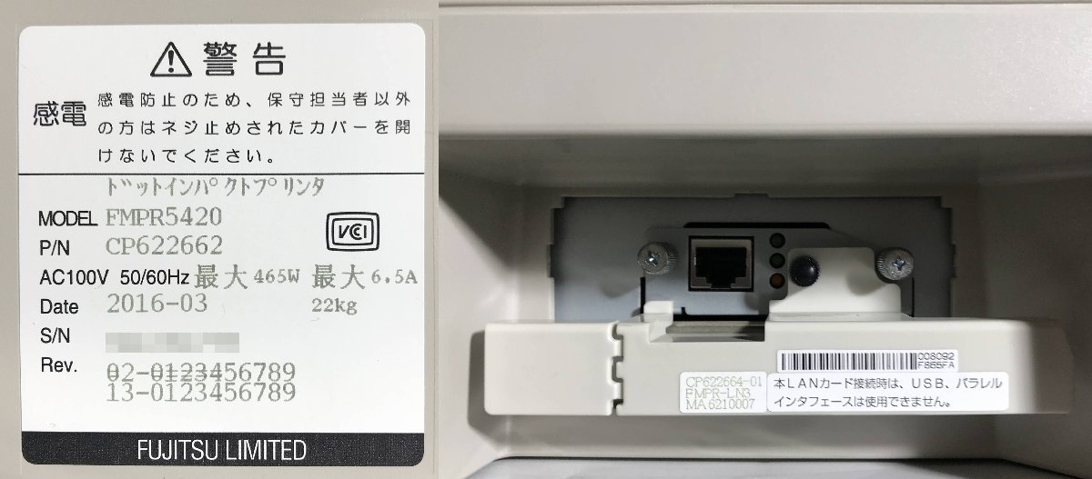 仕様 | 外部寸法:W600×D350×H290mm 質量:約22kg インターフェース:USB、ネットワーク、パラレル 製造年月:2016.3 詳しい製品仕様はメーカーページにてご確認いただけます。 Fujitsu Printer FMPR5000シリーズ 仕様 |