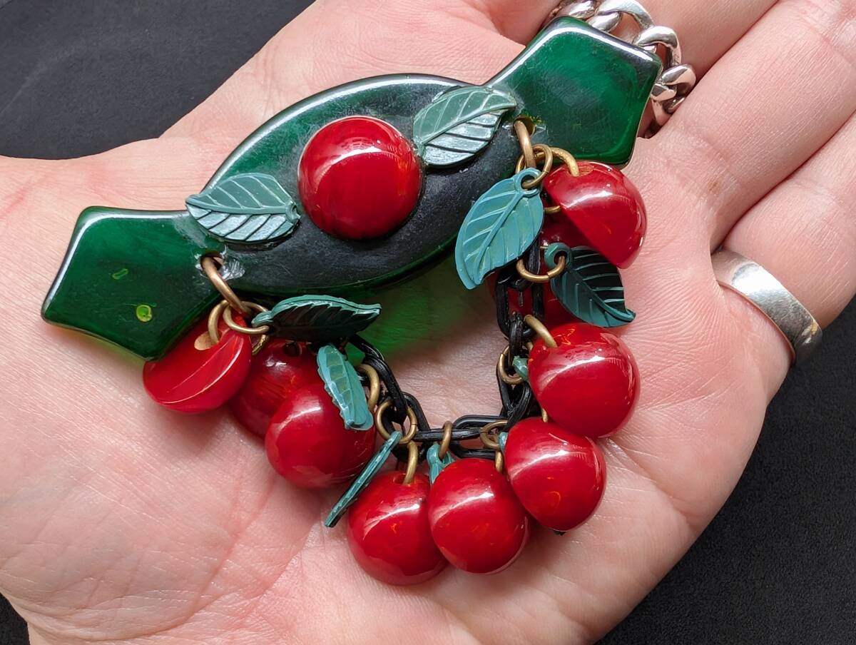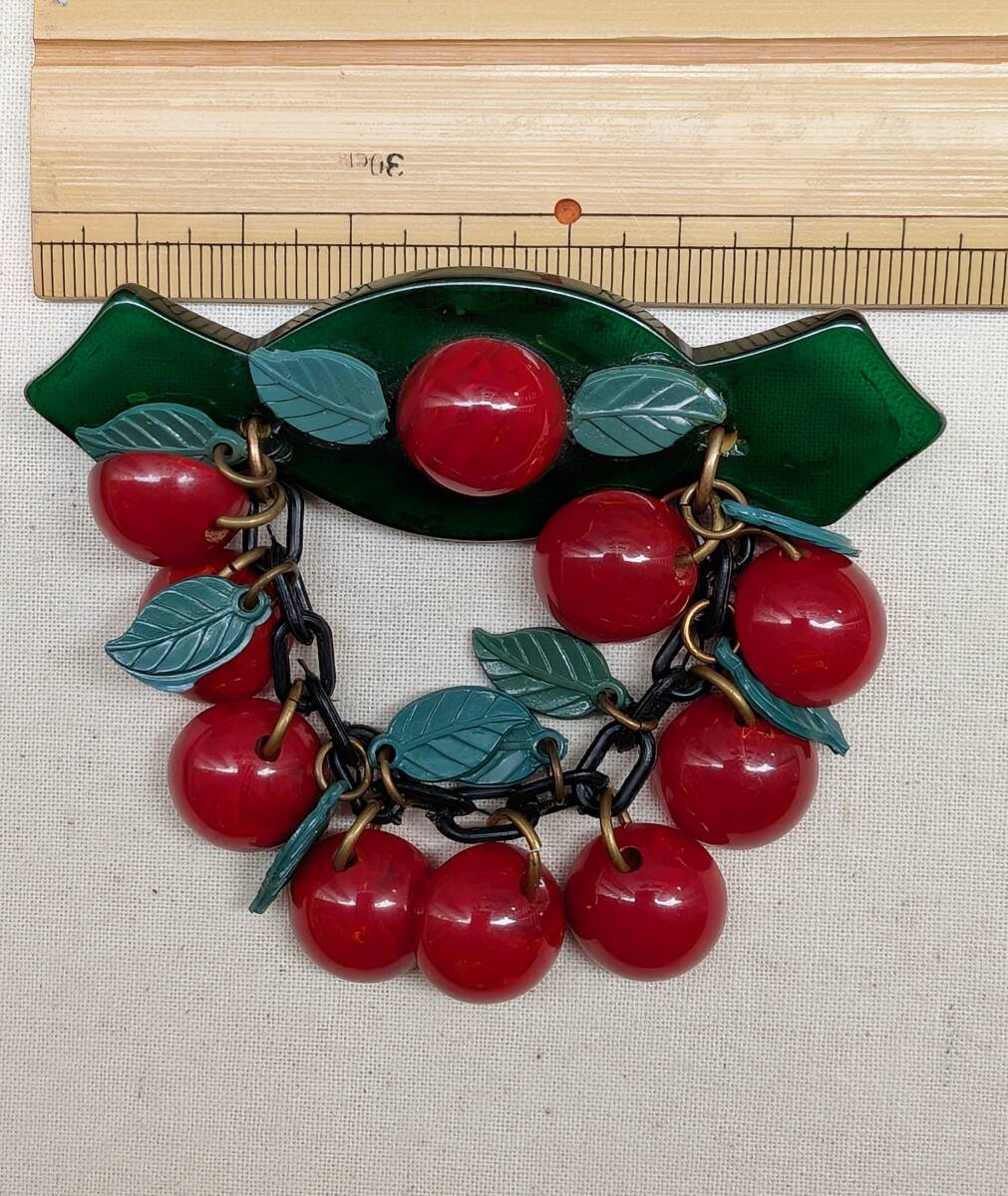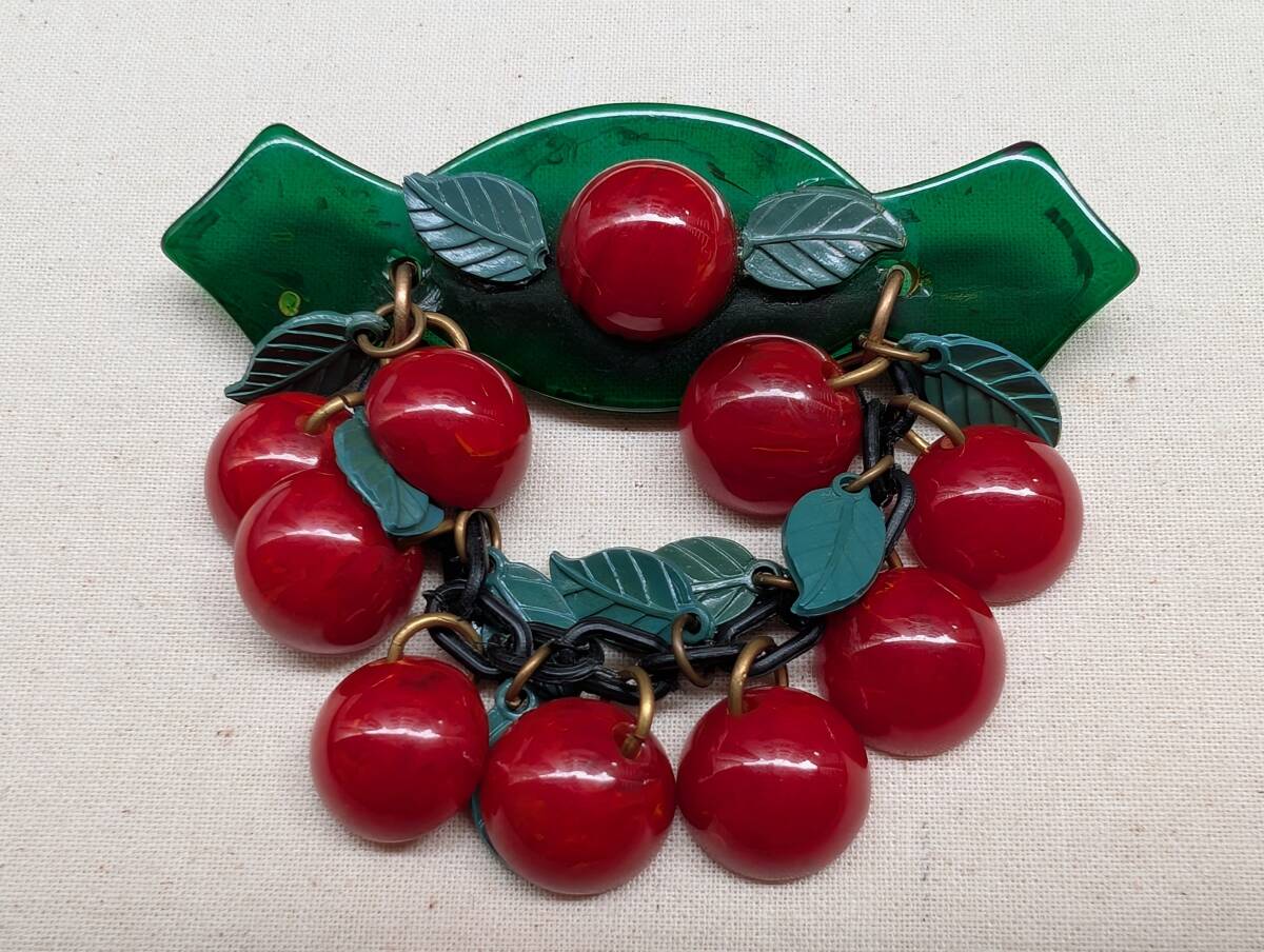30's40'sヴィンテージ ベークライトチェリーブローチ /50’sフランスヨーロッパアンティークロカビリーアールデコΓOT