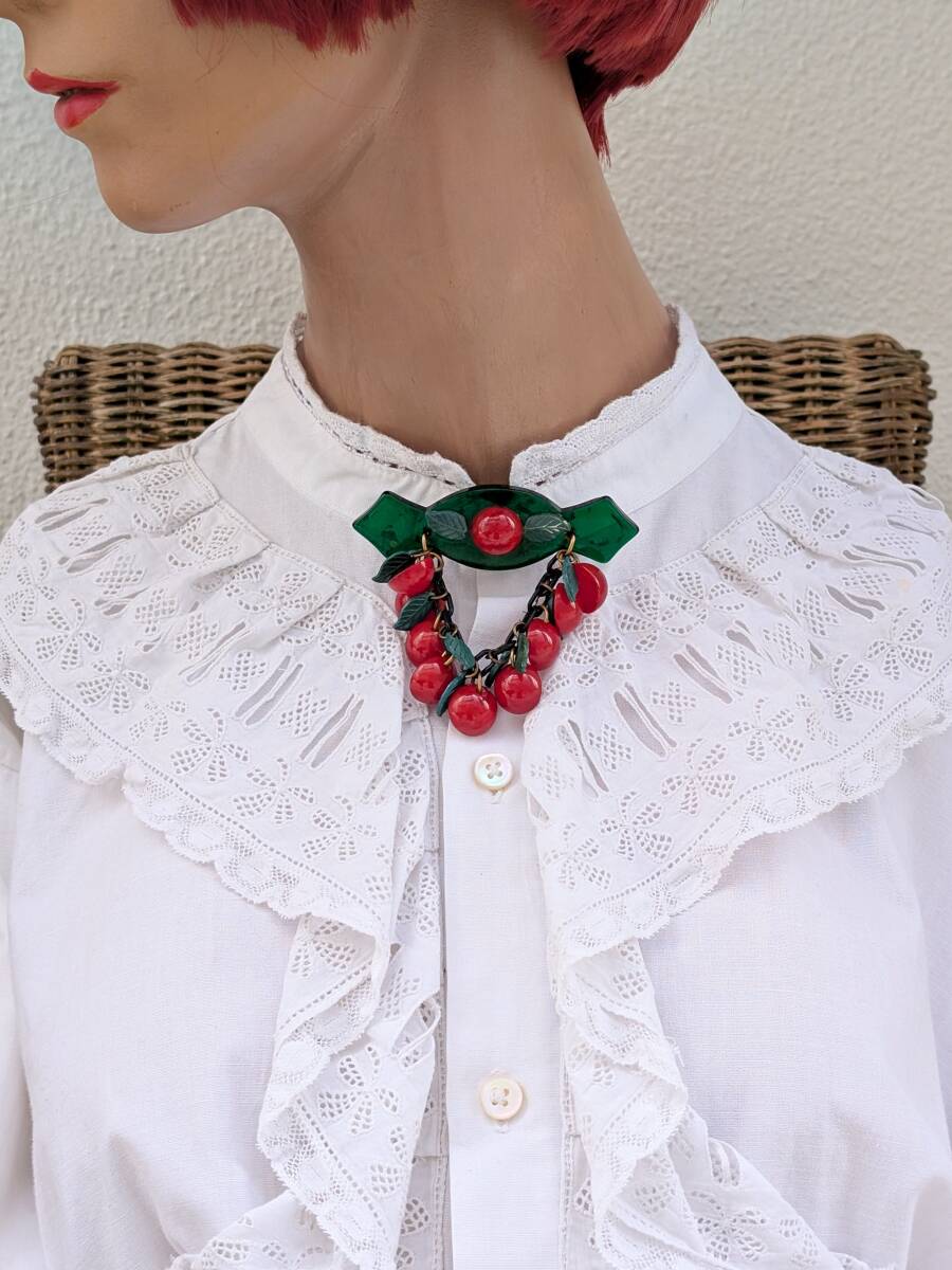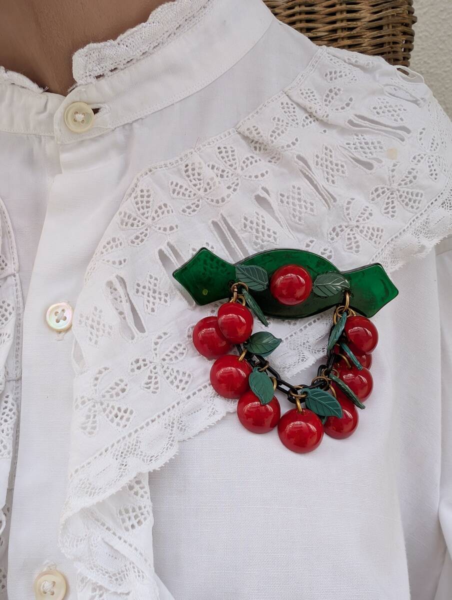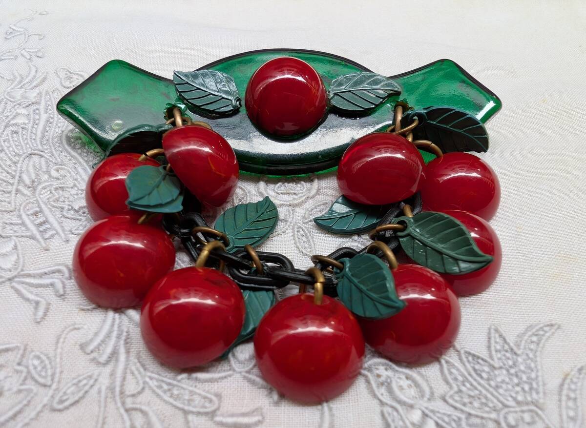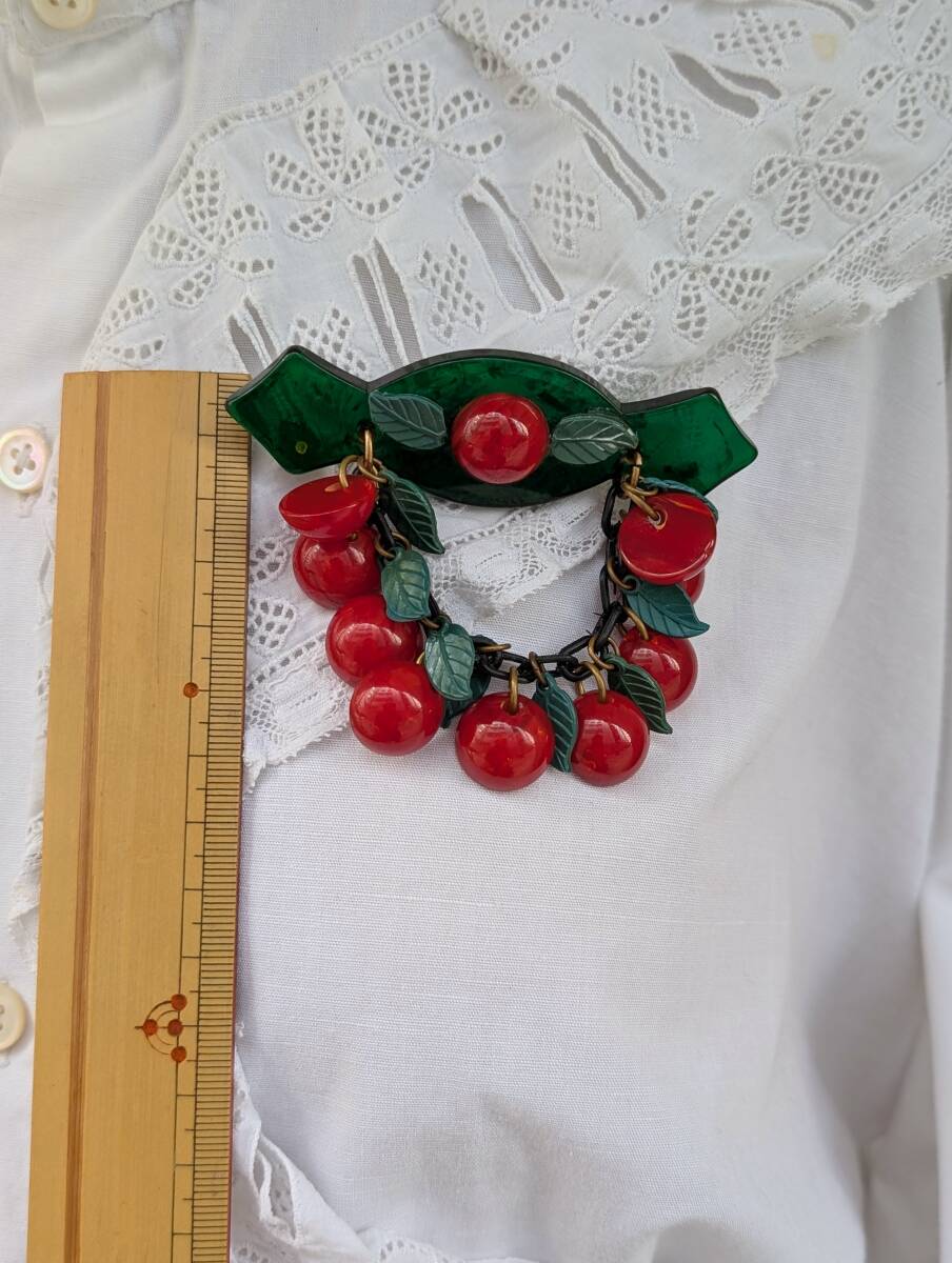 30's40'sヴィンテージ ベークライトチェリーブローチ /50’sフランスヨーロッパアンティークロカビリーアールデコΓOT