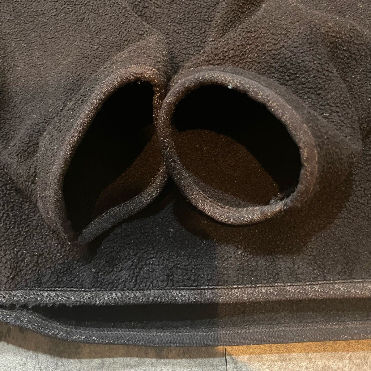 配色はフリースが超希少色のブラック、ナイロンがブルー、パイピングもブラックになります。