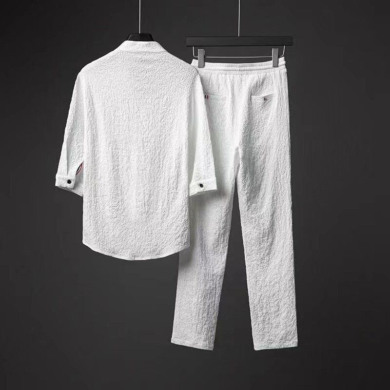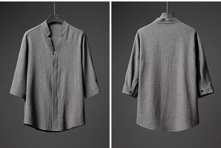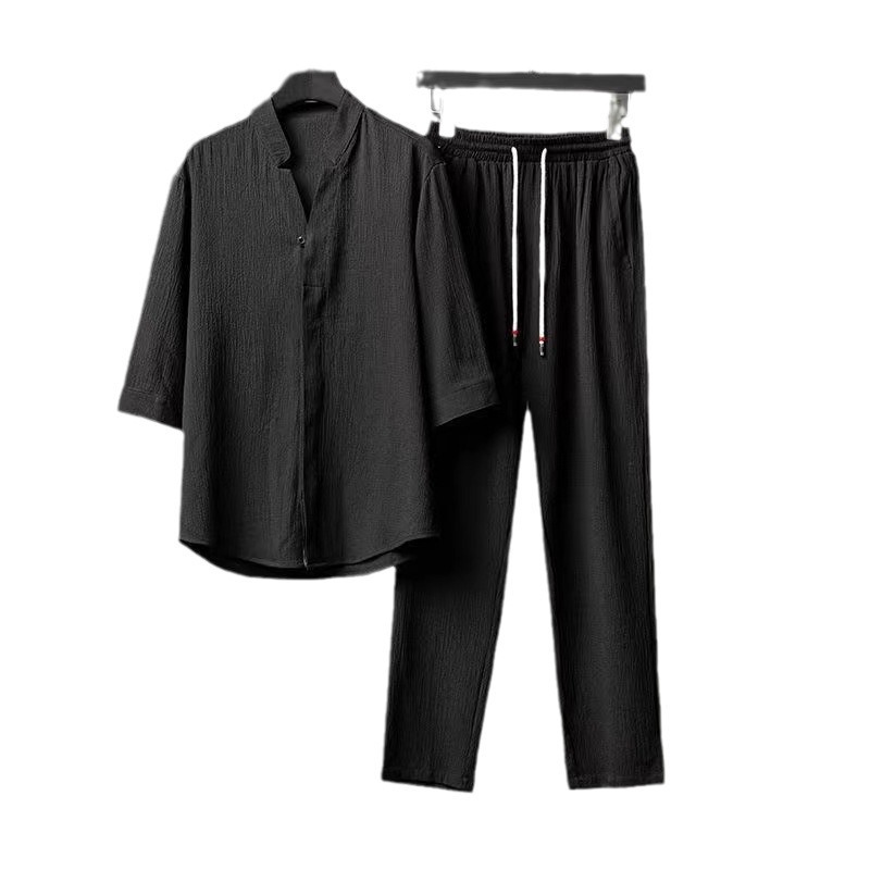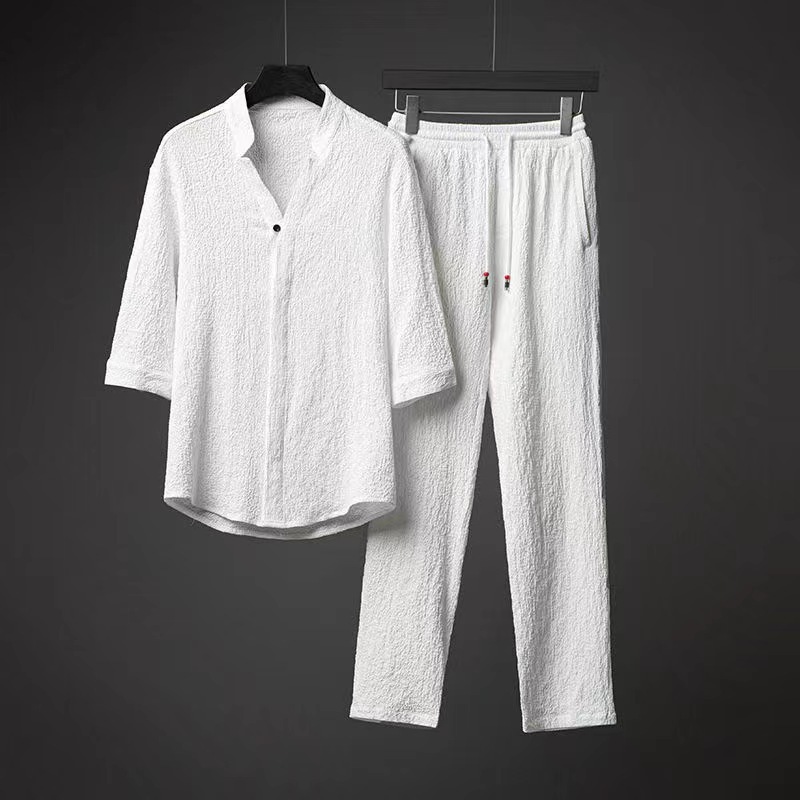 人気メンズ上下2点セット セットアップ ロングパンツ 綿麻風 接触冷感 五分袖シャツ チノパン 吸汗速乾 ルームウェア部屋着 夏 グレー 5XL