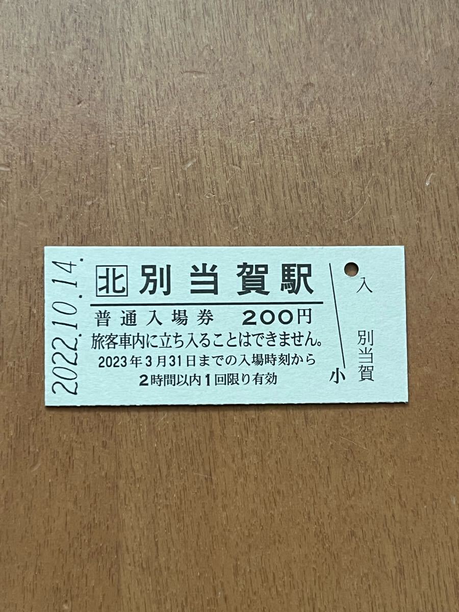 JR北海道根室本線別当賀駅のB型硬券入場券です。(2022年)