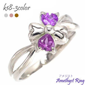 商品コード 111025001-am 発送は2週間ほどです≪2月の誕生石≫アメジストアメジストの石言葉は「誠実」「高貴」「心の平和」です。ハートの石で四葉のクローバーの指輪を作成しました。アメジストの透き通るような紫色が指先を明るく演出♪四葉のクローバーを見つけた時の幸せな気持ちをあなたに・・・。また、大切な方への贈り物にいかがでしょう。※天然の石を使用する場合、素材の大きさ・形・色は1点1点多少異なります。※お客さまがお使いのモニターの設定等により色の見え方が実際の商品と異なることがございます。◆商品詳細材質 K18ゴールド(ホワイト・ピンク・イエローよりお選びいただけます) 宝石名 天然アメジスト ハートカット3.5mm×2pc大きさ リング最大幅 約8.5mm備考 材質の刻印入りお届け 約2週間(当店営業日)SA-287