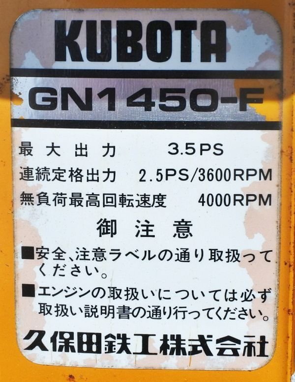 ●最大揚量:600L/min ●最大馬力:3.5馬力 エンジン始動後、給排水・加圧動作は確認しましたが、 実作業による実演での動作は未確認の状態になります。 ※給水ポンプは付属しておりません。 農機具特有の使用に伴う傷汚れ、錆等の使用感が見られます。 |