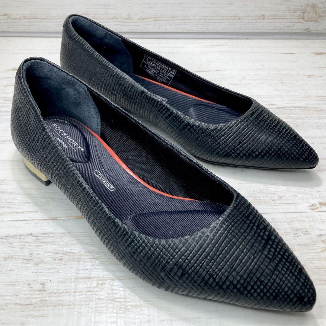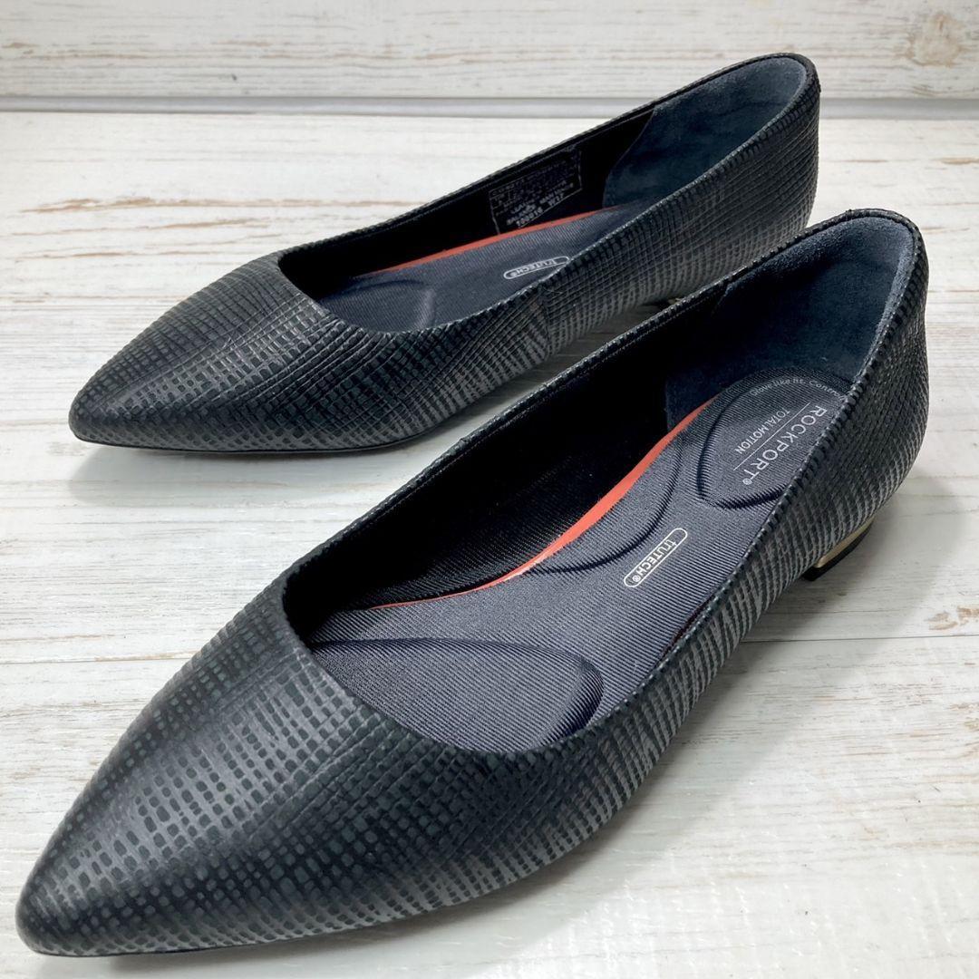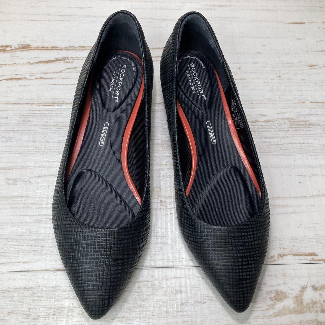 皮革製のブラックポインテッドトゥパンプス、クッションインソールで快適な履き心地。