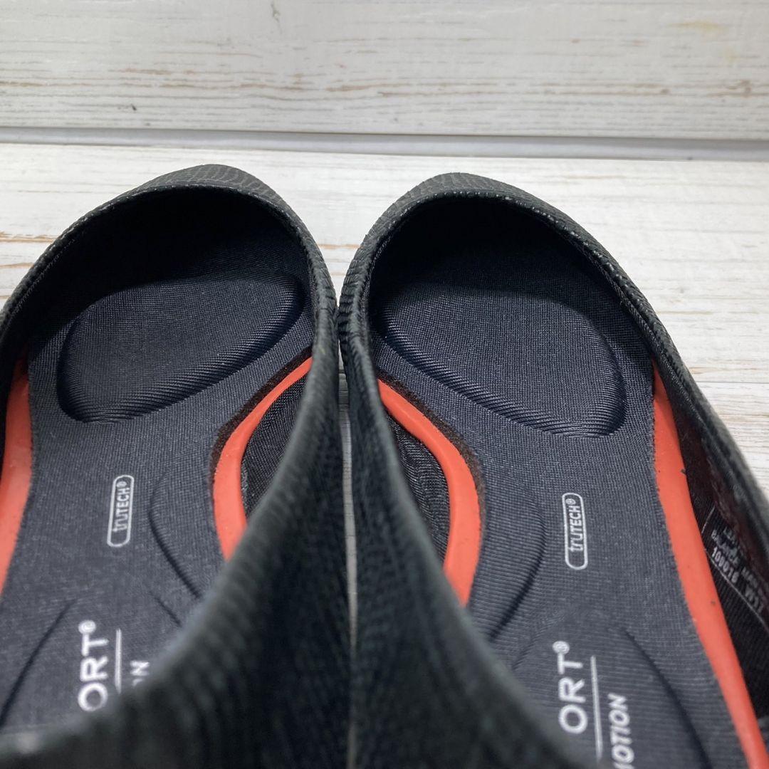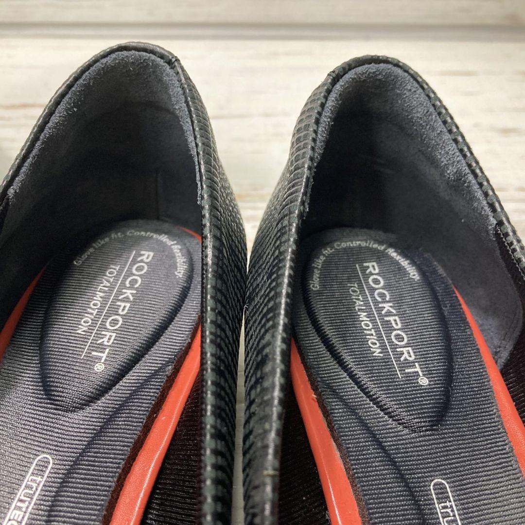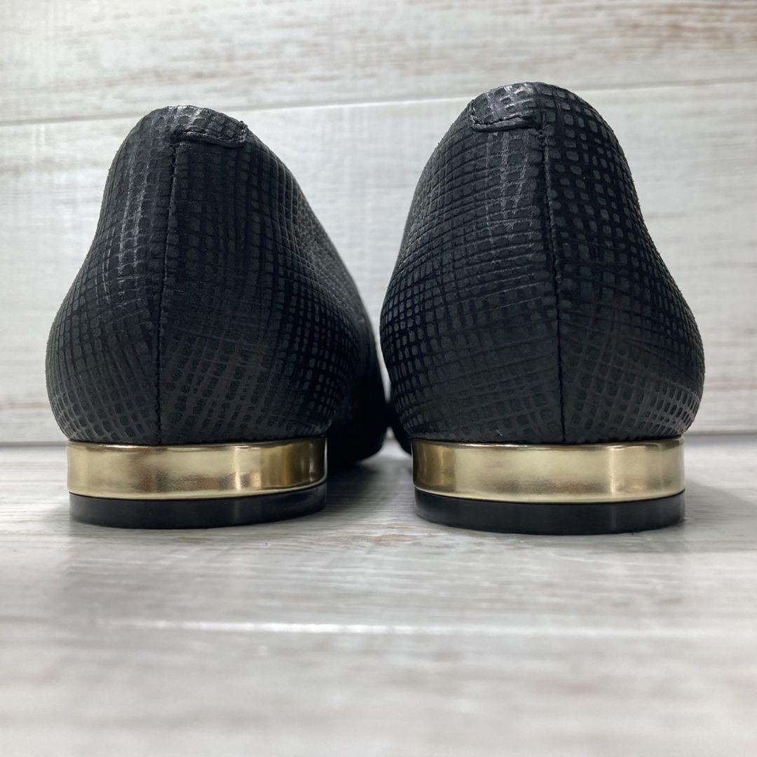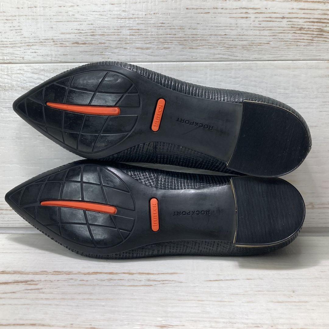 皮革製のブラックポインテッドトゥパンプス、クッションインソールで快適な履き心地。