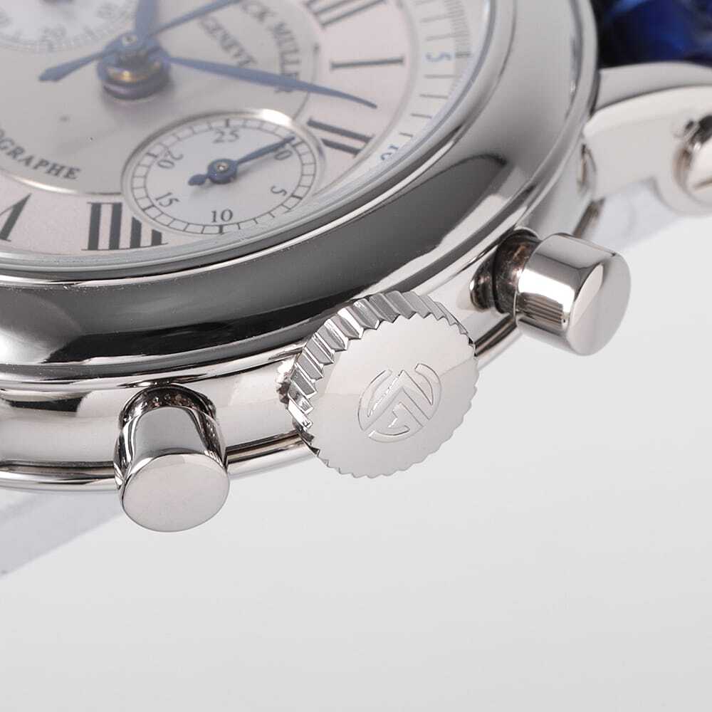 モデル情報 | フランクの初期に製造されたラウンドウォッチです。レマニア社製Cal.1870をベースにしたクロノグラフムーブメントを搭載しています。非常に入荷が難しく、中古市場でもほとんど見かけないモデルです。ケースバックからはムーブメントの精巧な動きをご覧いただけます。 |