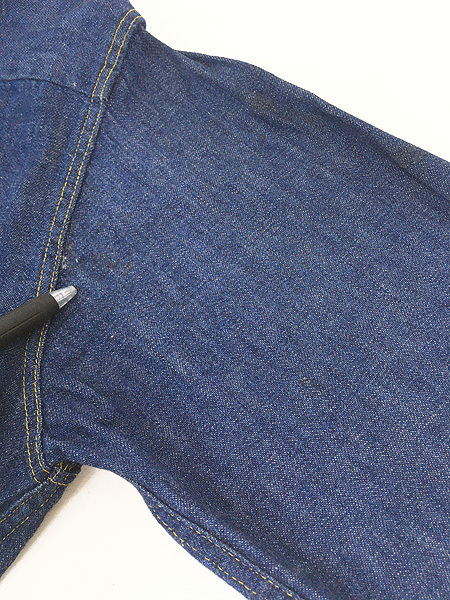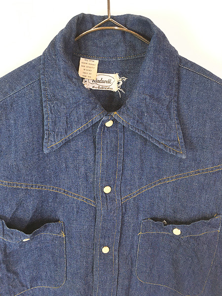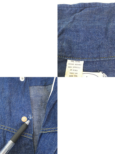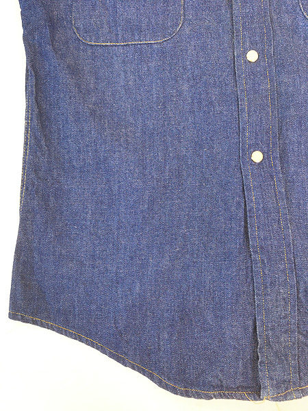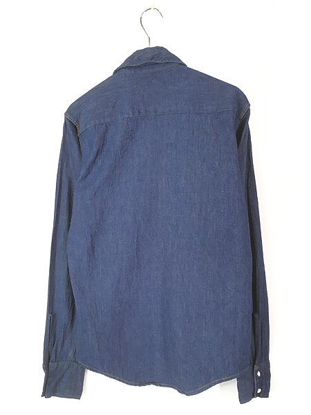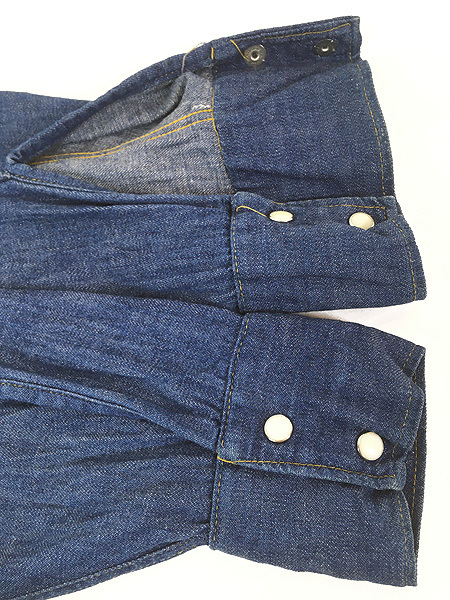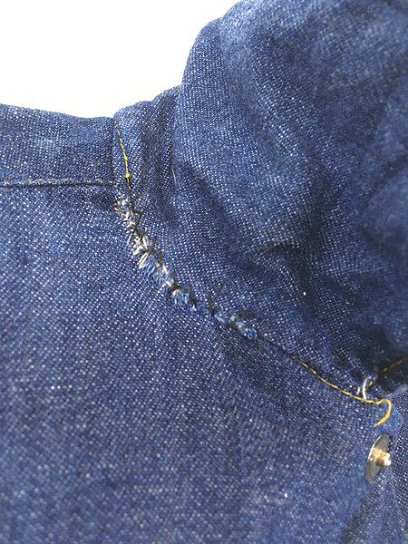 かすかにデニム糊が残る100%コットンインディゴデニム・襟芯入り・トップボタン含めフルスナップボタン・前立て裏ミミ付。