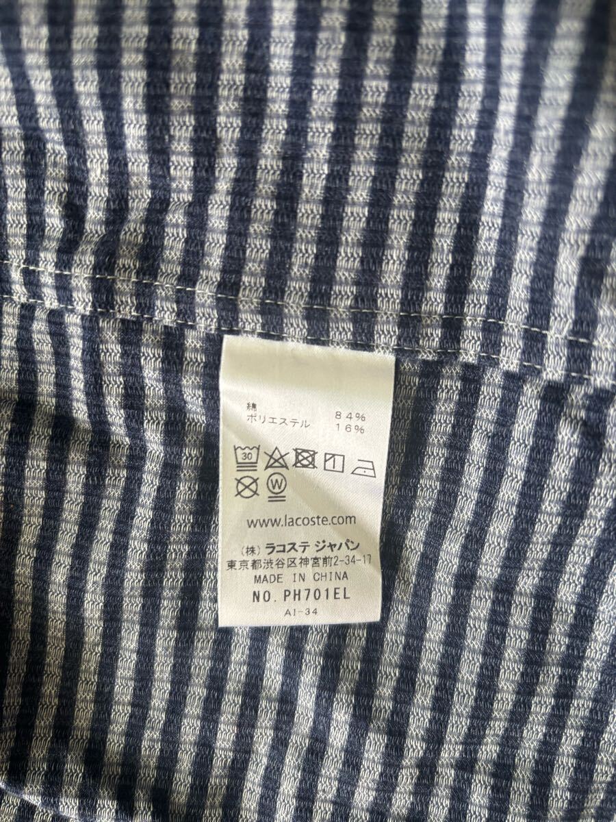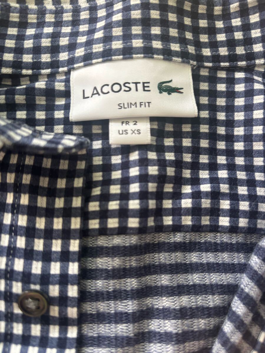 ネイビーとホワイトのチェック柄、スリムフィットのLACOSTE長袖シャツ。